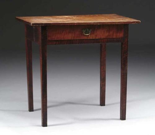 TIGER MAPLE CHIPPENDALE ONE DRAWER STAND. This one drawer table has tiger maple legs and skirt with an old pine top which is probably a later replacement. There is a pullout candle slide at the center of the back apron. The dovetailed drawer is fitted with a period batwing brass. Legs have molded bead to one corner, all in a nice early finish. SIZE: 27” h x 29-1/2” w (top) x 18-1/2” d. CONDITION: Very good. Top has weathered surface. 8-87301