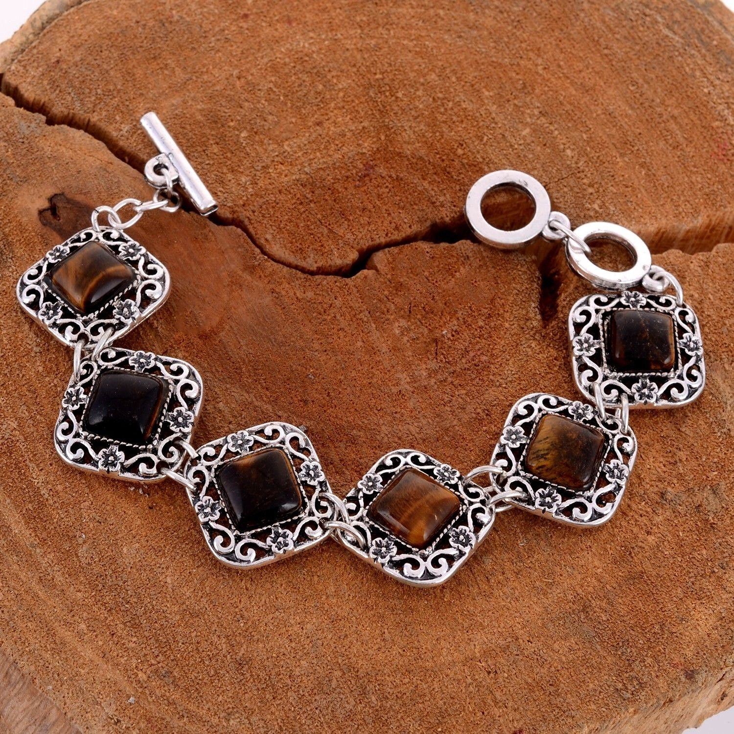 TIGER'S EYE GEMSTONE SILVER PLATED BRACELET , JEWELRY TYPE : BRACELET , BRACELET LENGTH : 8 INCHES (WITH ADJUSTABLE LINKS) , BRACELET WEIGHT : 25.90 Grams