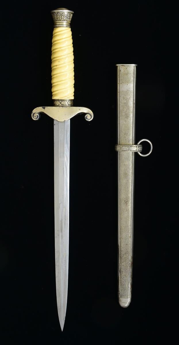Overall length: 15 1/2". Blade is marked, “(tiger)TIGER SOLINGEN”. Plated crossguard, ferrule & pommel cap. Cream colored grip. Plated scabbard w/ a single scabbard loop & ring intact. CONDITION: blade has a pleasing finish free of dark spots. Crossguard has slight finish loss. Grip is undamaged. Scabbard has some shallow dents & wear concentrated near the tip. Top suspension ring is missing. (02-15188/BF). $300-500.