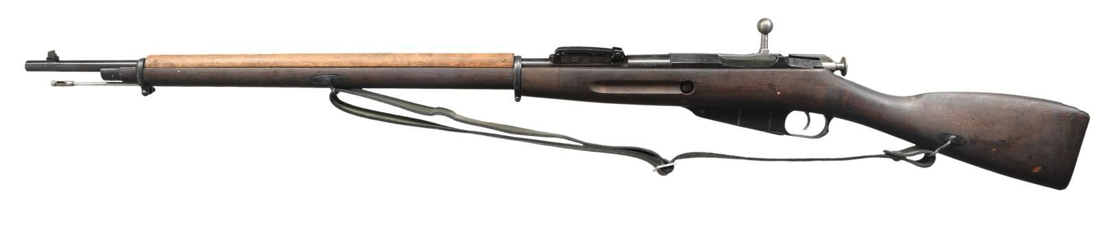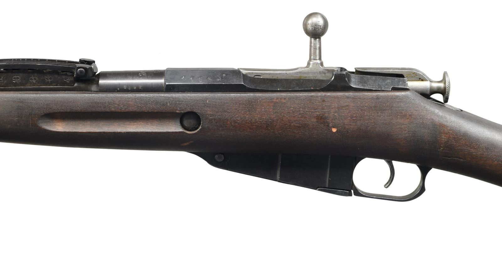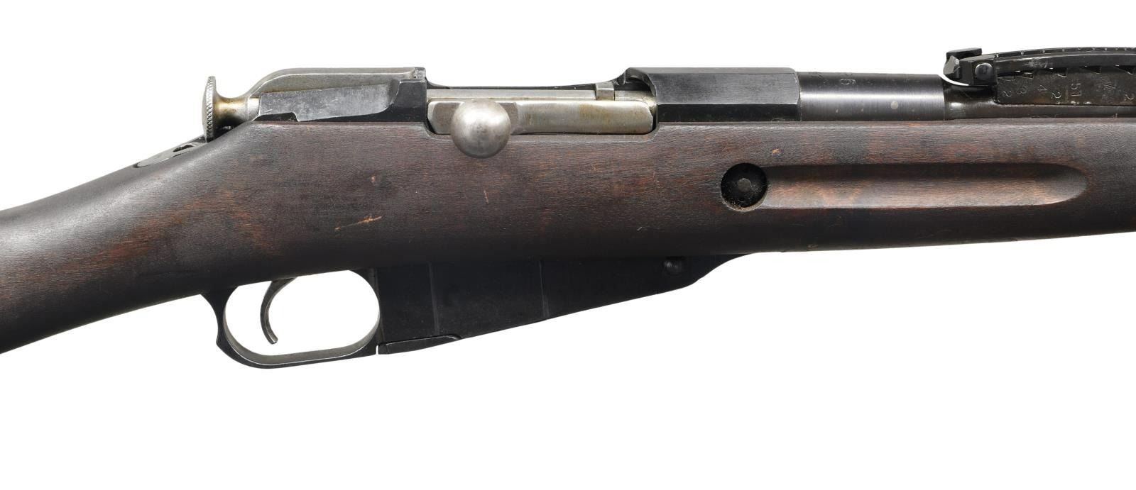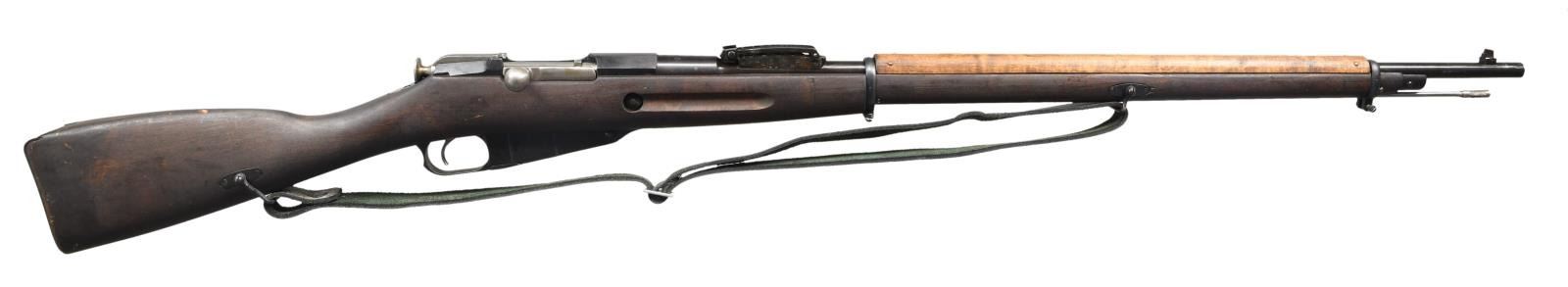 Cal. 7.62x54R. S# 24586. Bbl. 31" w/ import marking. Matching numbers on bolt knob & bbl. Other parts unnumbered. Top of bbl. has Finnish Army "SA" marking, Tikka logo, serial & 1941 date. Left side of receiver has importer added serial. Ladder rear sight graduated to 3200 Arshins w/ Finnish graduations on the sight base. Blade front sight. Two piece birch stock set w/ lighter color handguard & sling hangers. Leather sling & incorrect cleaning rod present. CONDITION: stock set has dark oil finish w/ a few plug repairs, a few scratches, scattered dings & handling marks. Metal retains 95% arsenal blue finish. Very good bore w/ some light frosting. (23-2043/MJC). CURIO. $200-400.