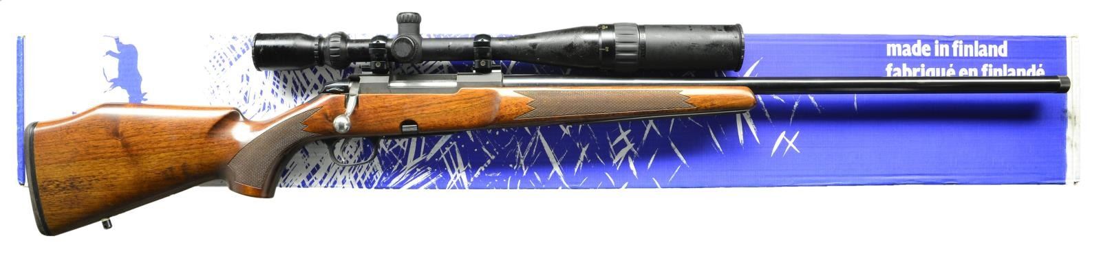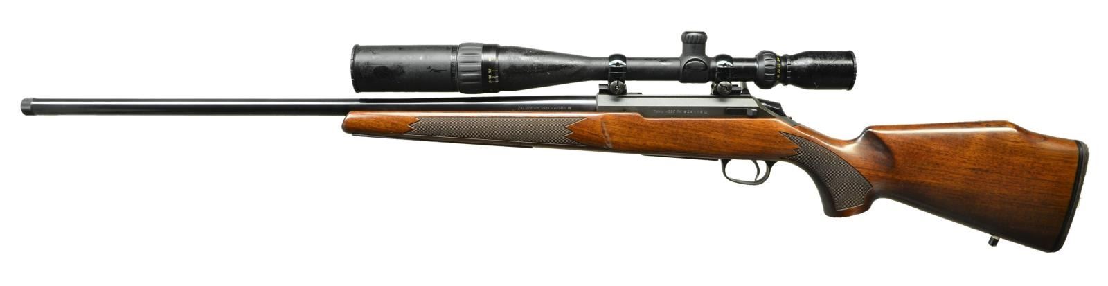 CONTENDER SCOPE. Cal. 308 Win. S# 904118. The 26" medium weight bbl. w/ maker’s marks at rear has threaded muzzle w/ knurled protector. Blued bolt action w/ single trigger has removable box mag. Pistol grip Monte Carlo stock measures 14 1/8" over brown rifle pad. Point pattern laser checkering is at grip & on broad forend. Rifle is mounted w/ BSA Contender 8-32x scope w/ duplex reticle & weaver type rings & mounts. UNATTACHED ACCESSORIES: rifle comes w/ its original box. CONDITION: fine, metal retaining nearly all factory blue. Stock w/ only a few marks & dings in factory finish, most notably a fairly deep hit on toeline. Bore is bright & shiny. Action is smooth. Scope is good, exterior finish gummy. Optically good. (22-5258/MGM). MODERN. $600-900.