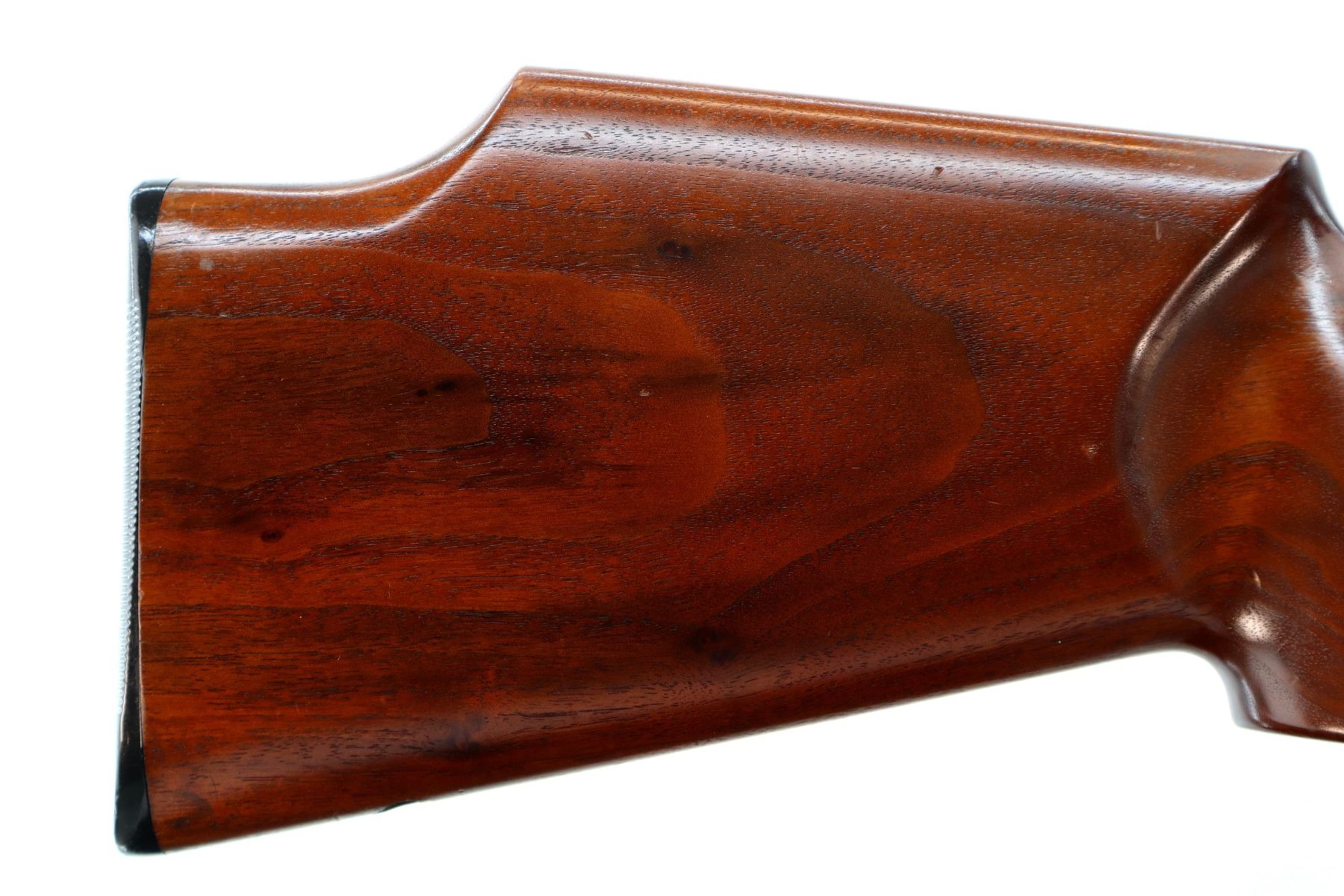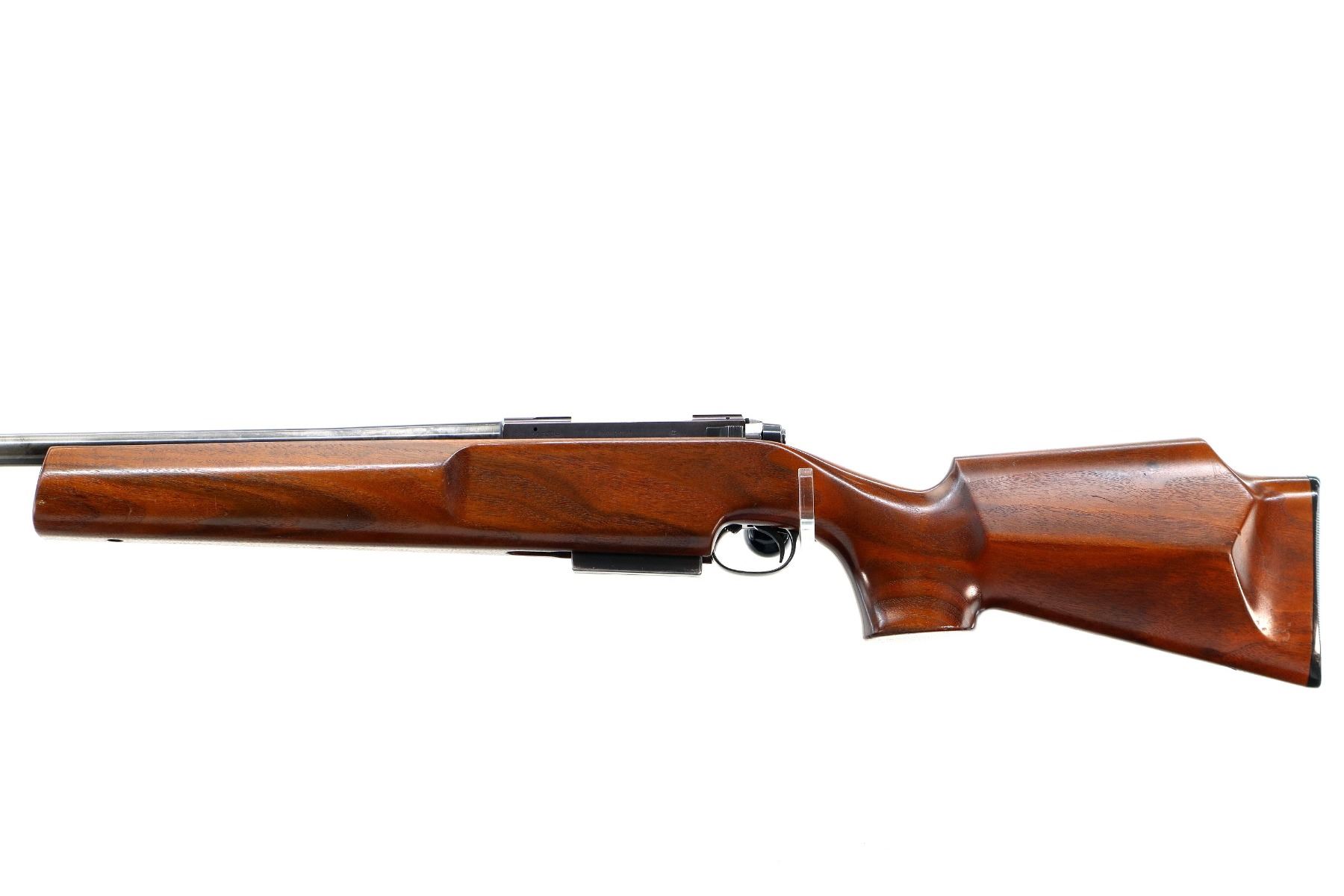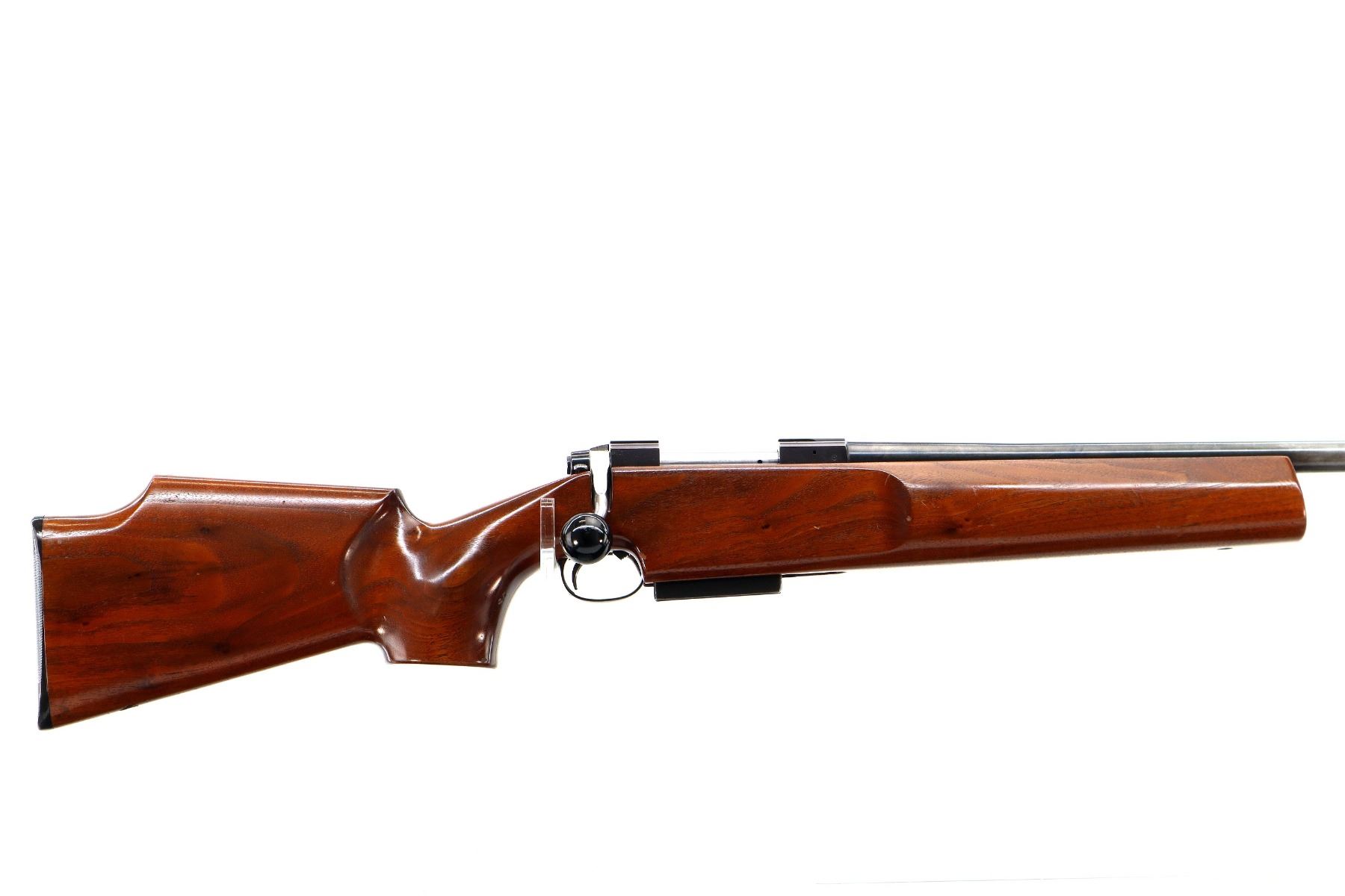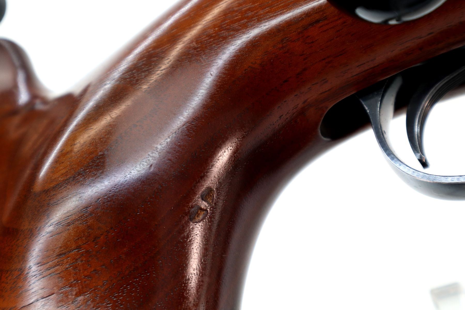 Main Description: No sights, blued finish, barrel has been modified and threaded at muzzle with no cap installed, receiver has integral scope bases and drilled and tapped with no plug screws installed. Large black polymer bolt knob. One piece target wood stock, wide forearm, thumb rest pistol grip, cheek rest, grooved black polymer butt plate, 13.25" LOP, missing swivels holes are present.