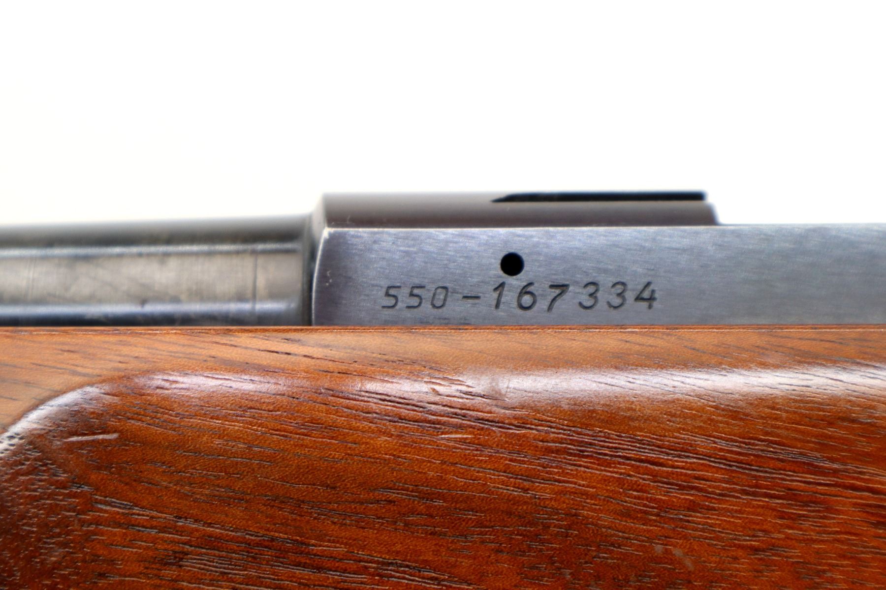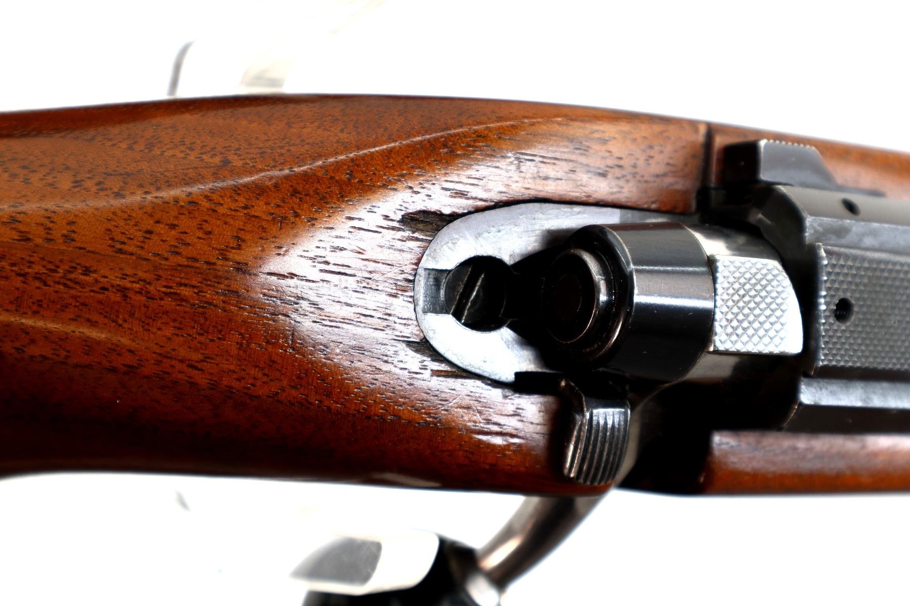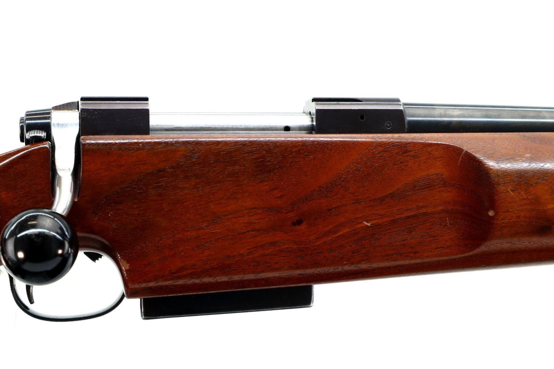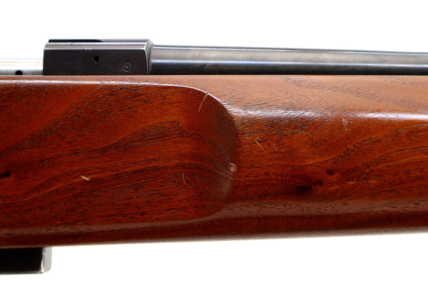 Main Description: No sights, blued finish, barrel has been modified and threaded at muzzle with no cap installed, receiver has integral scope bases and drilled and tapped with no plug screws installed. Large black polymer bolt knob. One piece target wood stock, wide forearm, thumb rest pistol grip, cheek rest, grooved black polymer butt plate, 13.25" LOP, missing swivels holes are present.