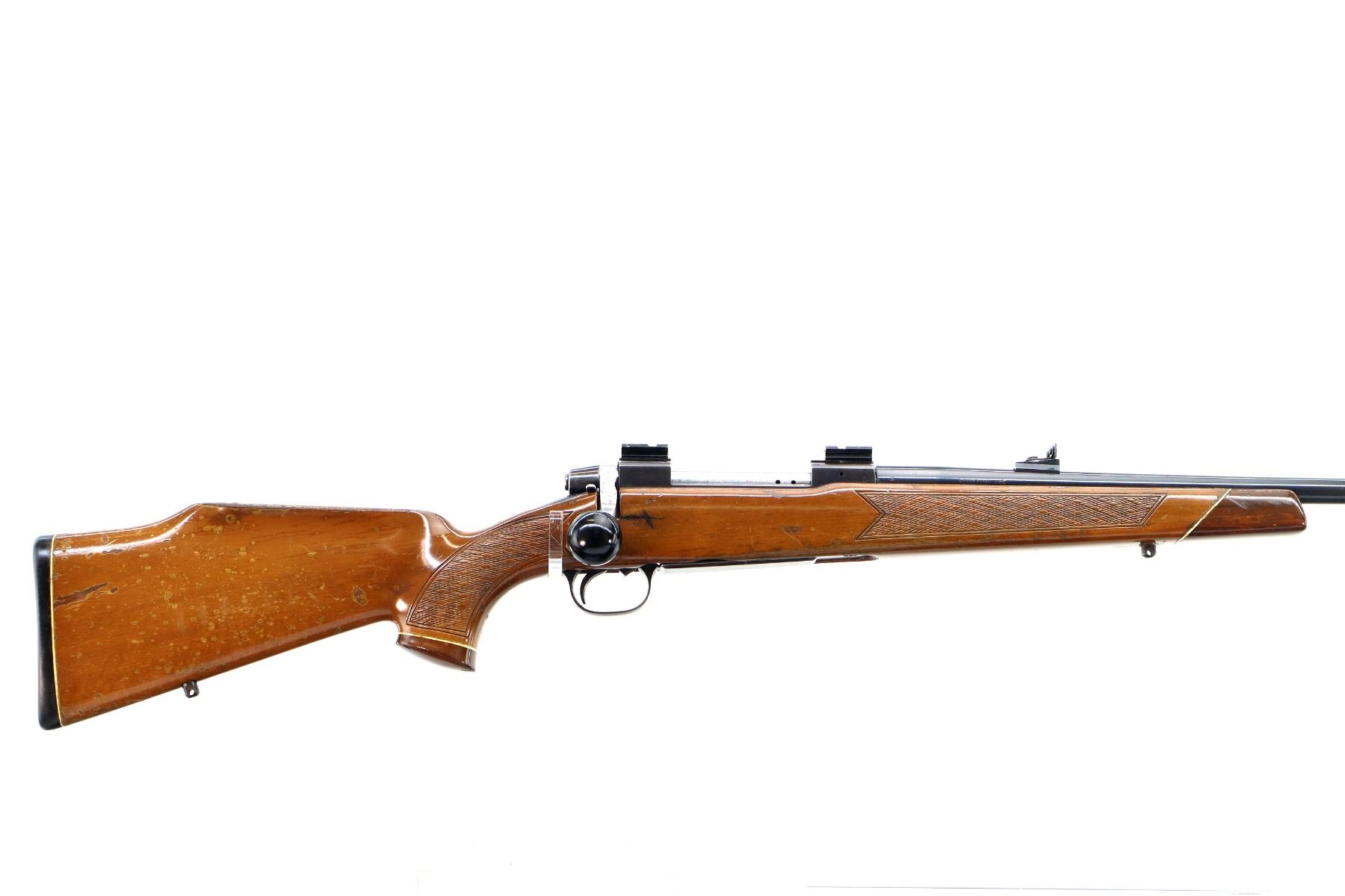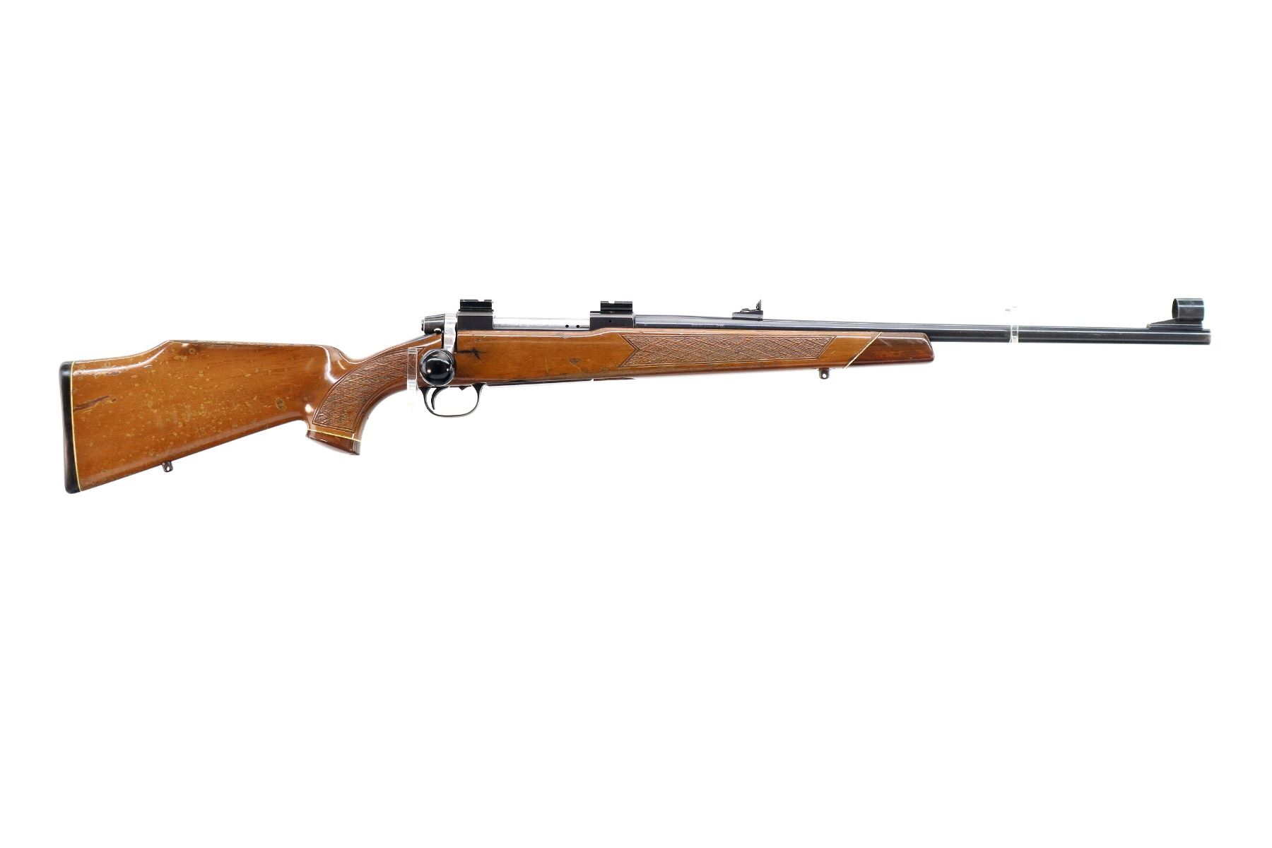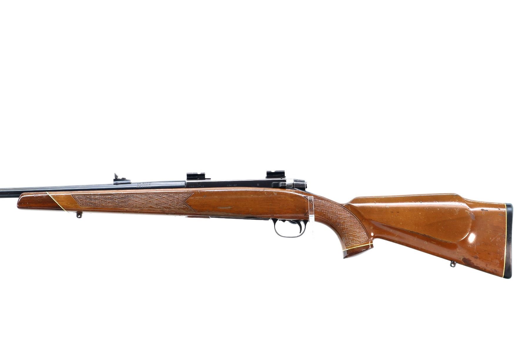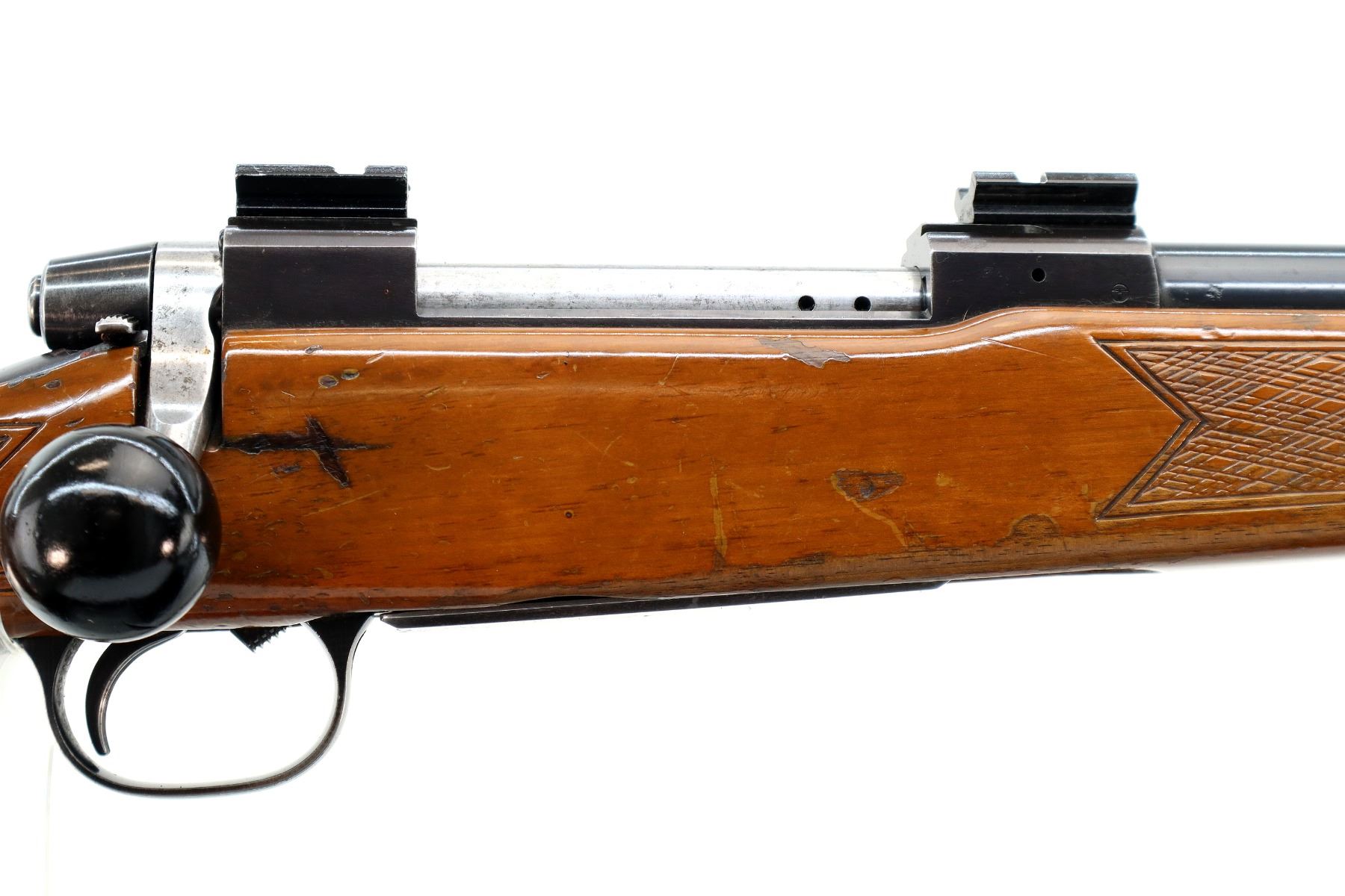 Main Description: Blade front sight with hood and ramp, adjustable u notched rear sight mounted backwards, blued finish, receiver has integral scope bases also drilled and tapped with two piece alloy bases installed, large black polymer bolt knob. One piece wood stock, rosewood forend and pistol grip caps, checkered forearm and pistol grip, rollover cheek rest, smooth black polymer butt plate, swivel studs, forend is cracked in front and behind the swivel stud.
