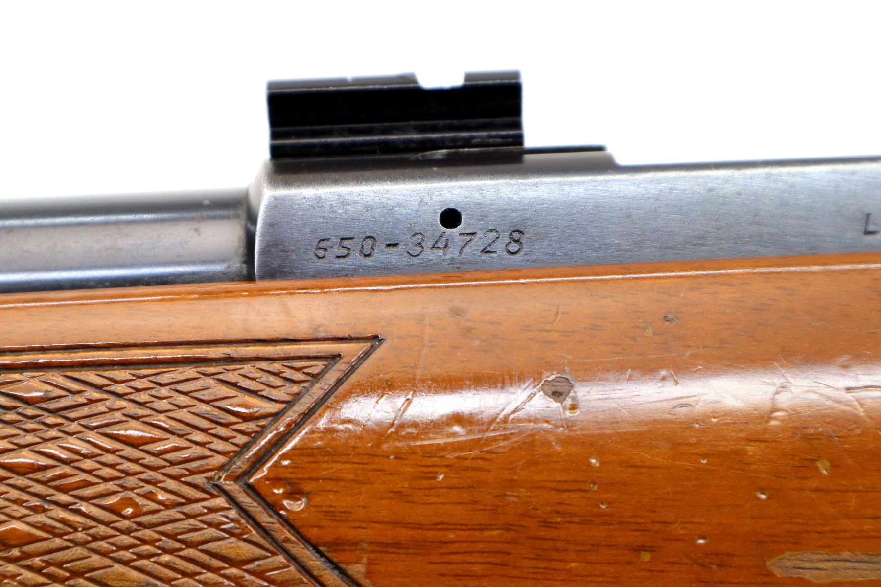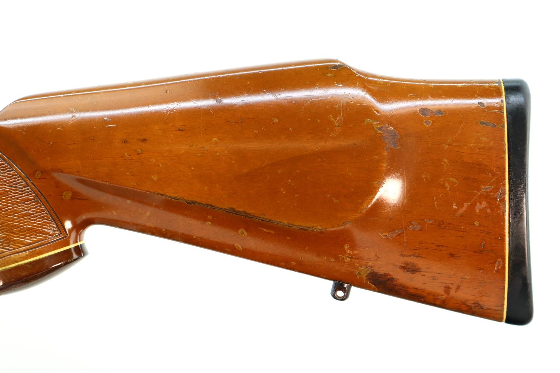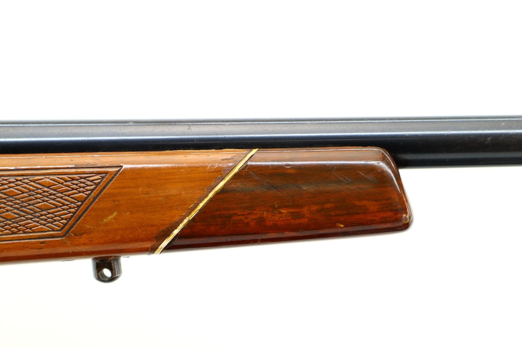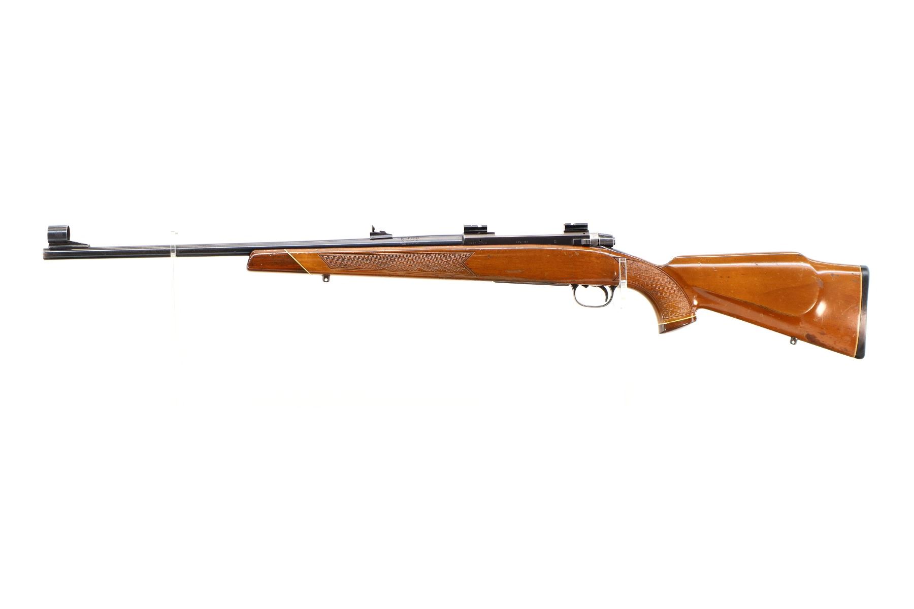 Main Description: Blade front sight with hood and ramp, adjustable u notched rear sight mounted backwards, blued finish, receiver has integral scope bases also drilled and tapped with two piece alloy bases installed, large black polymer bolt knob. One piece wood stock, rosewood forend and pistol grip caps, checkered forearm and pistol grip, rollover cheek rest, smooth black polymer butt plate, swivel studs, forend is cracked in front and behind the swivel stud.