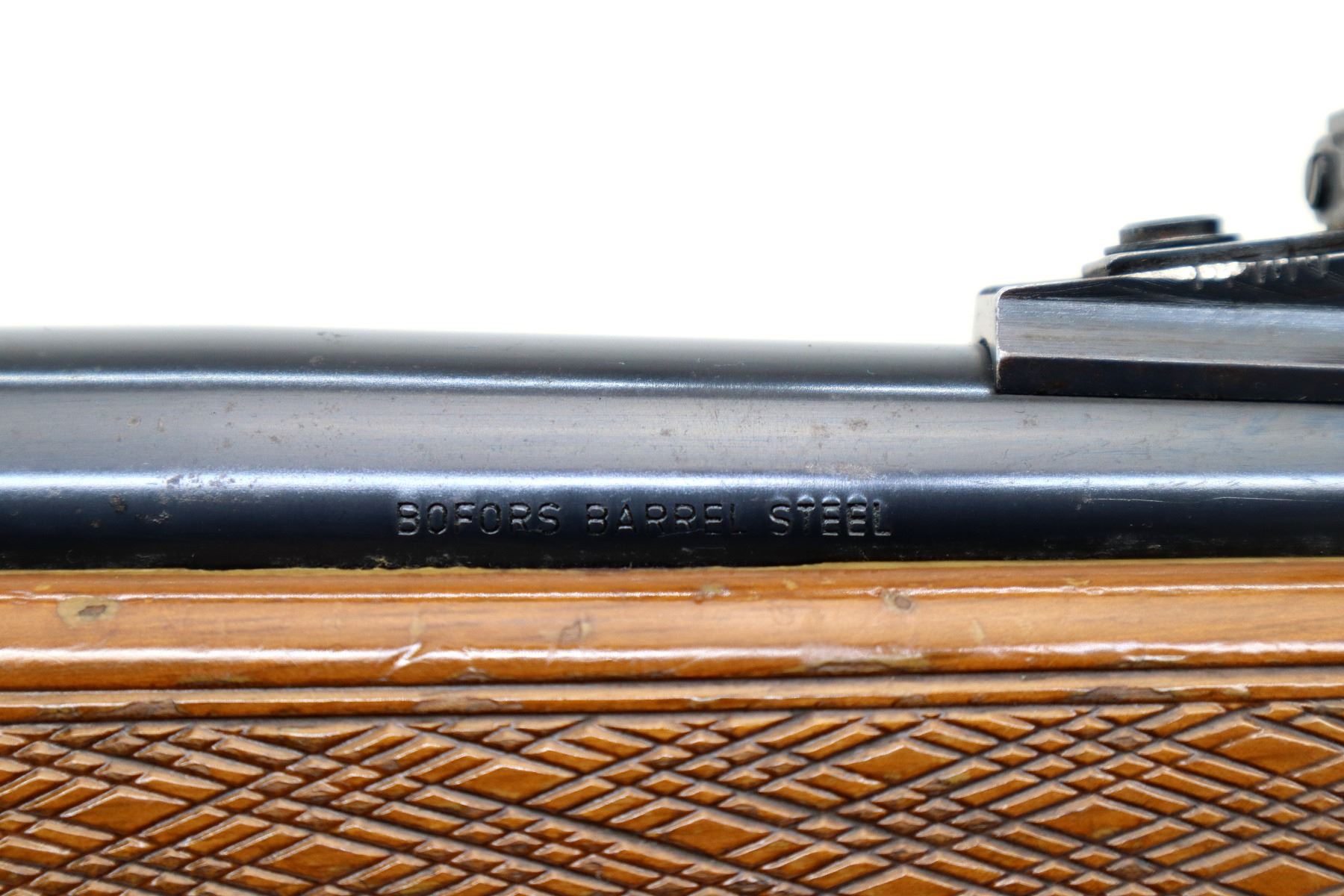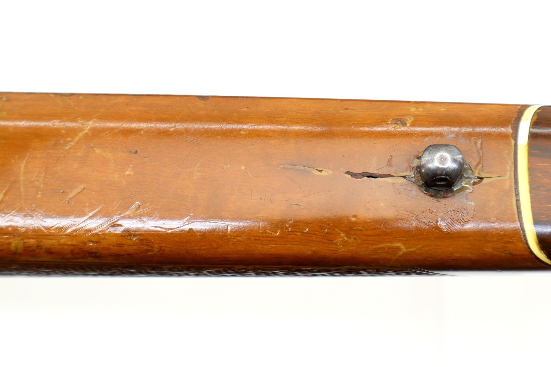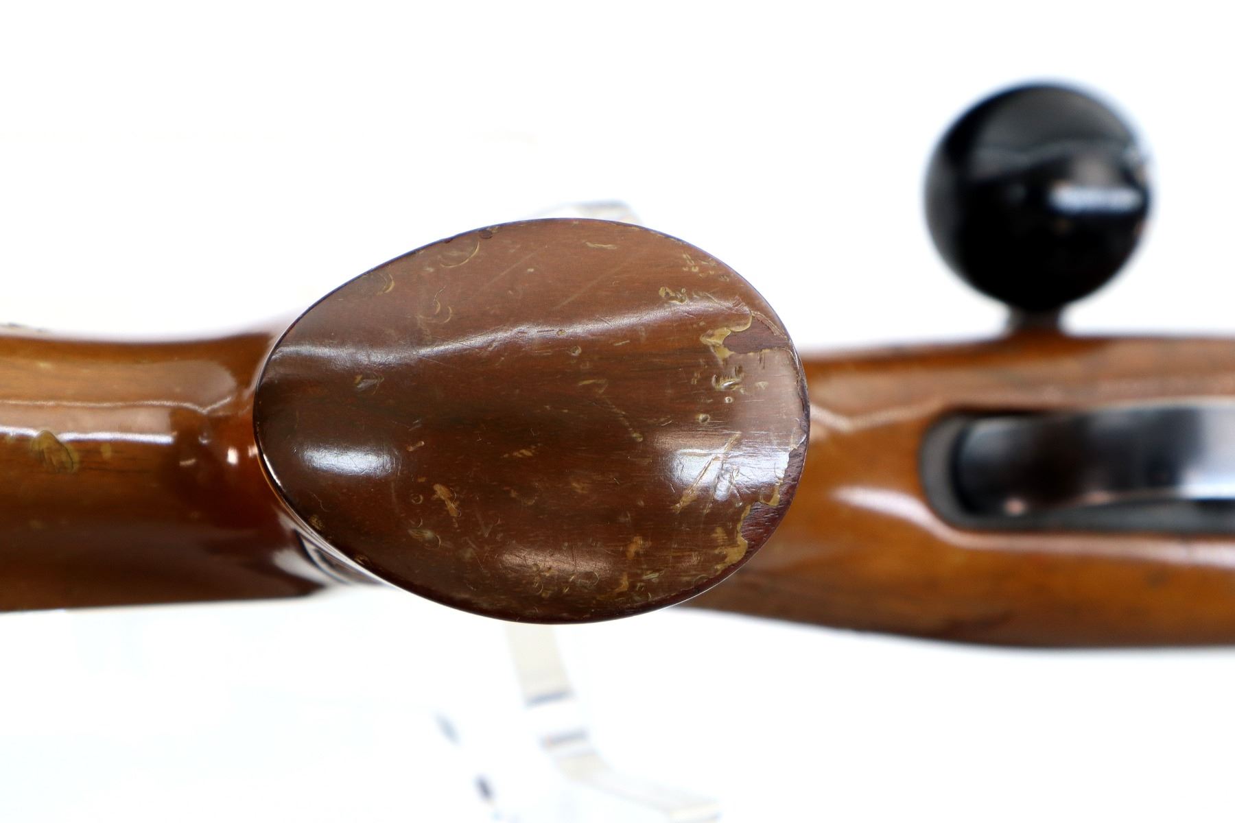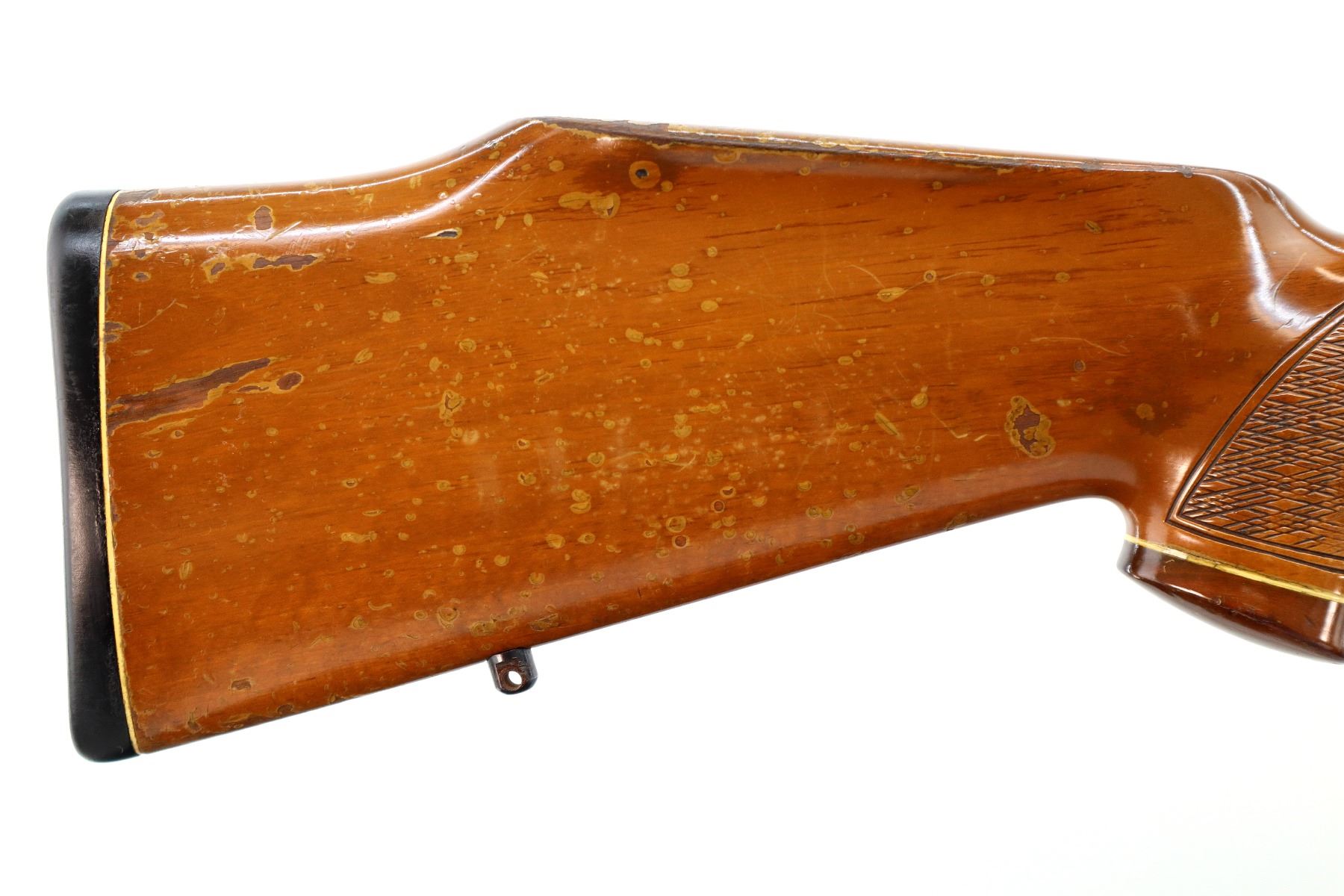 Main Description: Blade front sight with hood and ramp, adjustable u notched rear sight mounted backwards, blued finish, receiver has integral scope bases also drilled and tapped with two piece alloy bases installed, large black polymer bolt knob. One piece wood stock, rosewood forend and pistol grip caps, checkered forearm and pistol grip, rollover cheek rest, smooth black polymer butt plate, swivel studs, forend is cracked in front and behind the swivel stud.