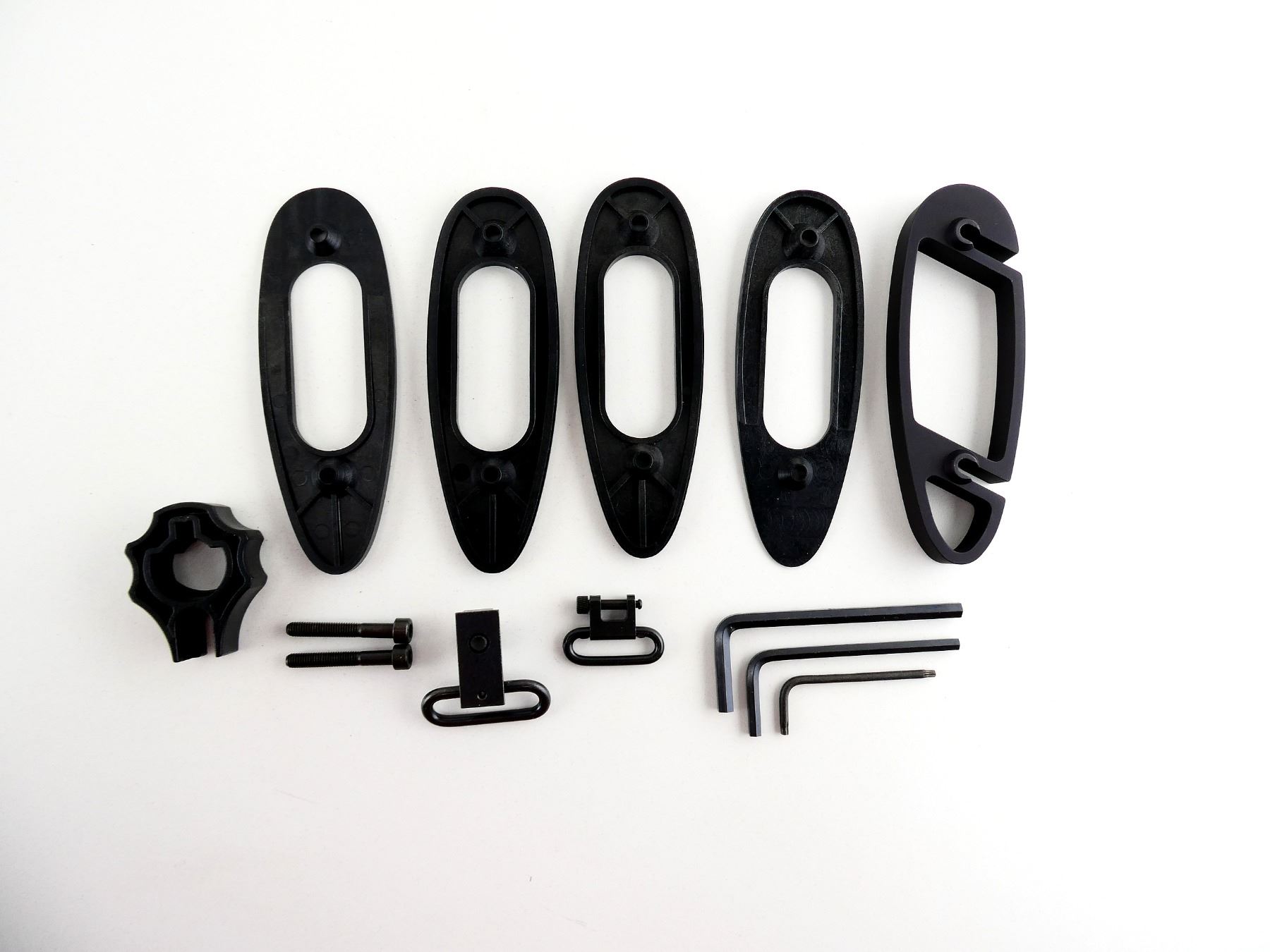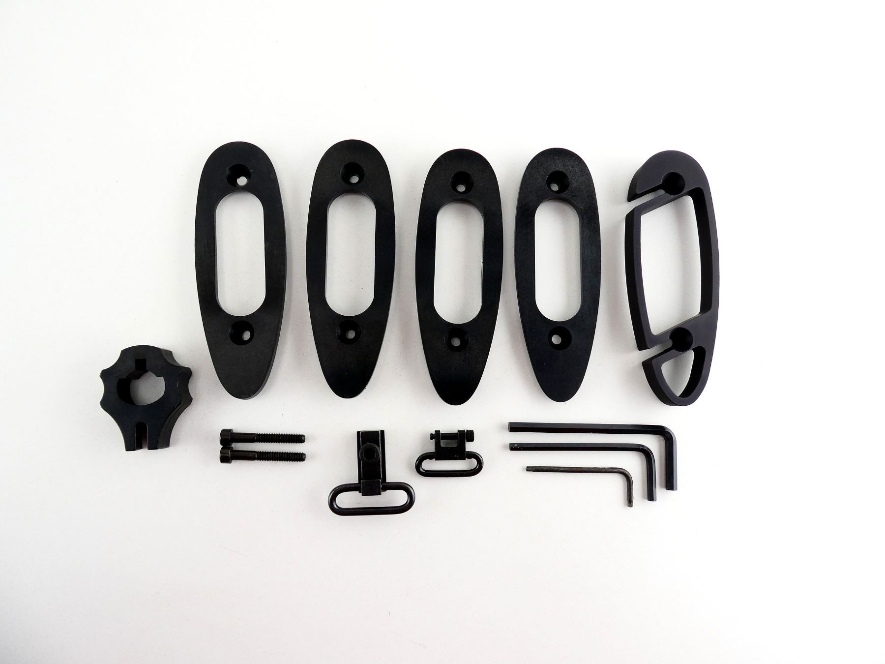 LOT INCLUDES; (5) BUTT PLATE SPACERS, SWIVELS, SCREW, BOLT TOOL, ETC. MAY REQUIRE FITTING. SEE PHOTOS.