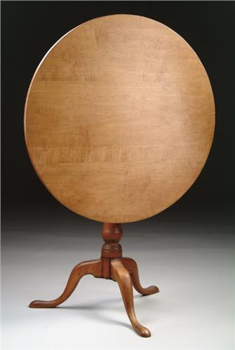 TILT TOP TEA TABLE. Replaced maple round top supported by an antique turned post base having three snake legs. Refinished. SIZE: 27in. h x 29-3/4in. dia top. CONDITION: Generally good. 9-26058