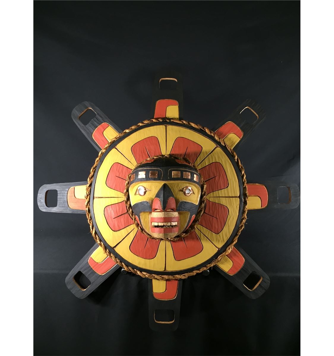 TIM ALFRED, KWAKIUTL, SUN MASK WITH COPPER AND ABALONE ACCENTS, 38" H X 38" W X 7" D