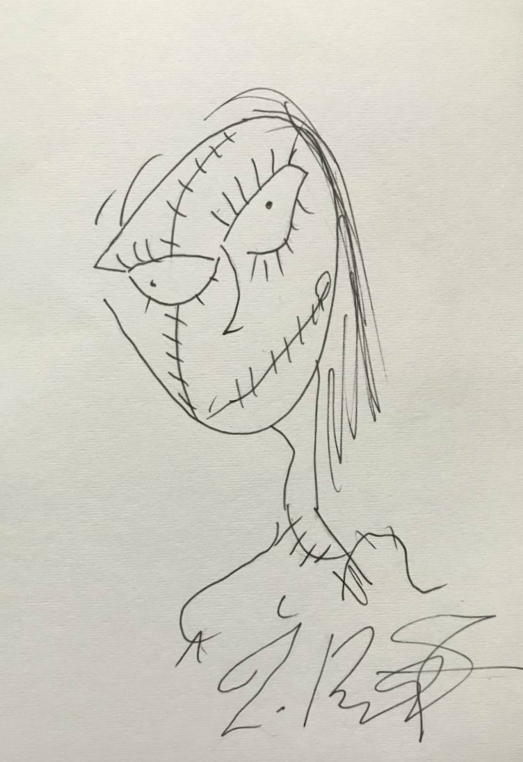 A drawing of Sally who is a rag doll and is 200 years old from one of Tim Burton's most famous cartoon movies. Drawn in black ink and additionally signed by Tim Burton. Size: 10x7 inches. Professionally mounted and framed. Supplied with coa.