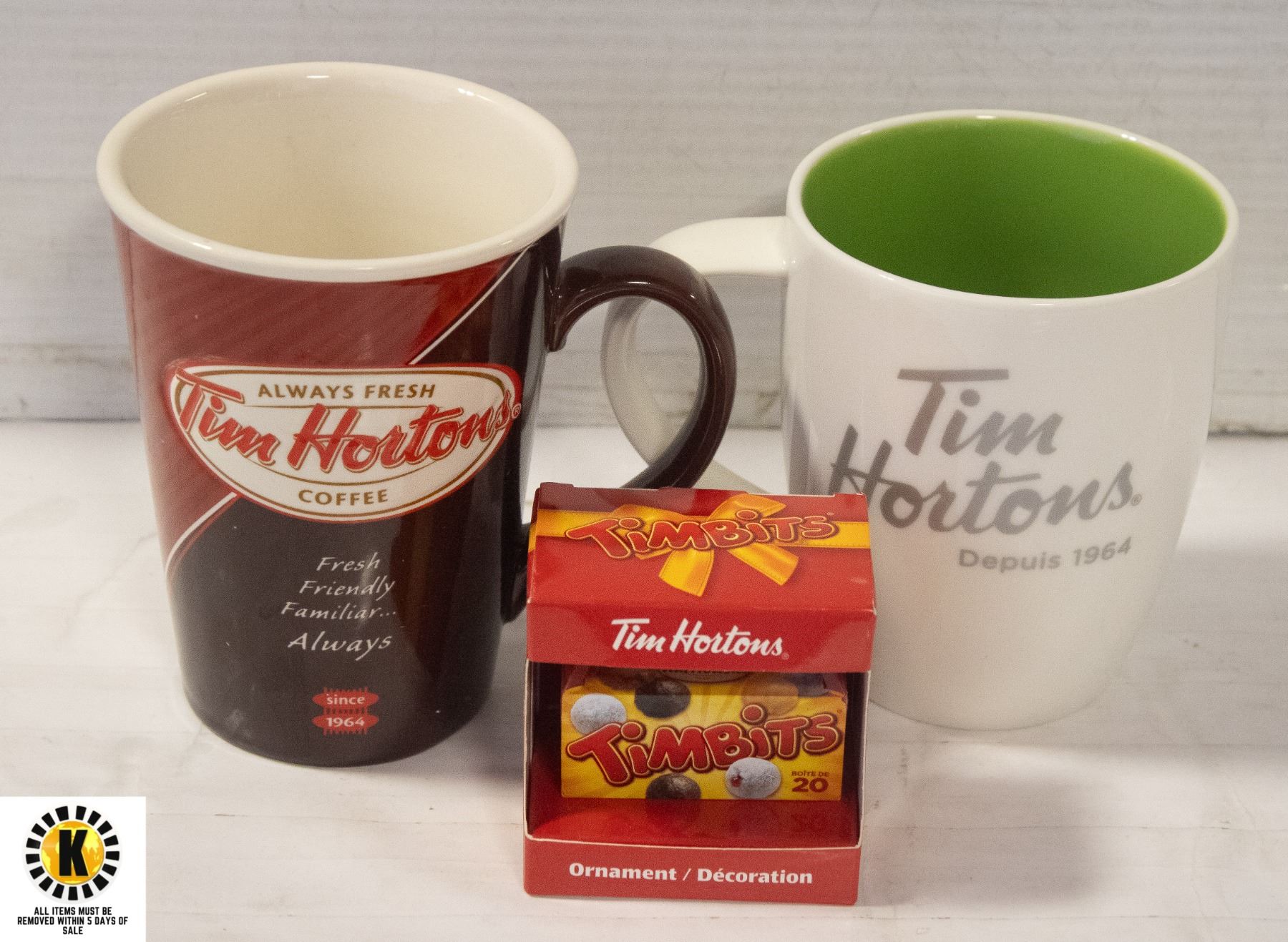 TIM HORTONS TIMBITS ORNAMENT + 2 HANDLED MUGS