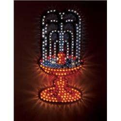 multicolor light fixtures, light bulbs and colored UFO caps, 5mm Foamex, vinyl, spray paint, electronic sequencer, 4-channel bubble and chase effect