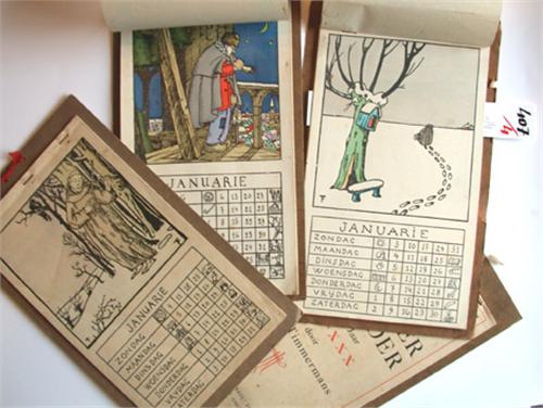 TIMMERMANS, Felix.- Pallieter - Kalender voor 1926 [1929, 1930 et 1931]. Antwerpen, De Sikkel; Amsterdam, Querido, 1926 [1929, 1930, 1931]. 4 kalenders in-f° (33 x 19,5 cm) : 4 x 13 ff. op karton geniet (enkele bruine vlekjes op titels, titel van 1931 ontbreekt).