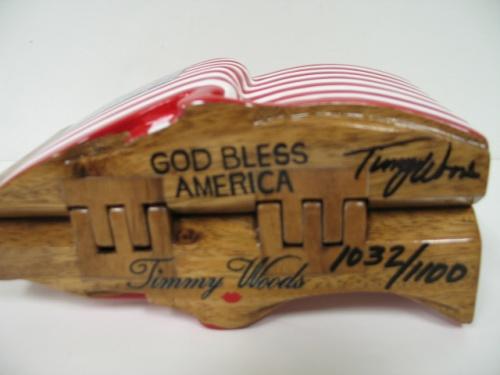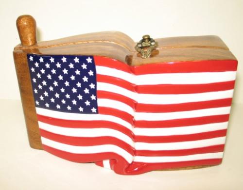 TIMMY WOODS ART TO WEAR ORIGINAL DESIGNS POCKETBOOK. American Flag decorated. Made from acacia wood. Has tags. Signed on bottom and numbered “1032/1100”. 4.5” H, 7.75” L