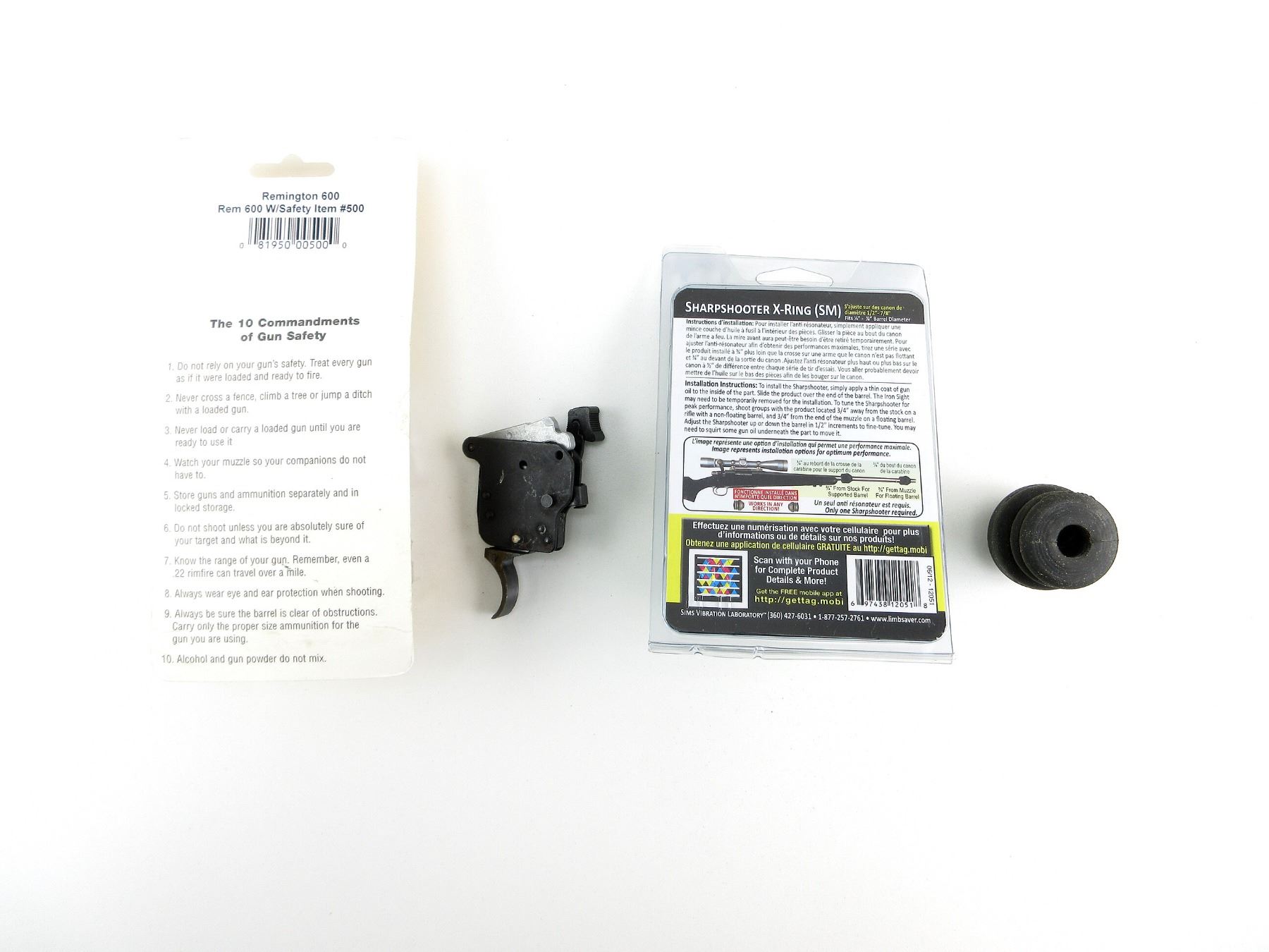 LOT INCLUDES; (1) REM 600 TRIGGER WITH SAFETY, PART #: 500, APPEARS NOS WITH ORIGINAL PACKAGING & (1) LIMBSAVER SHARPSHOOTER X-RING SMALL, APPEARS NOS IN ORIGINAL PACKAGING. MAY REQUIRE FITTING. SEE PHOTOS.