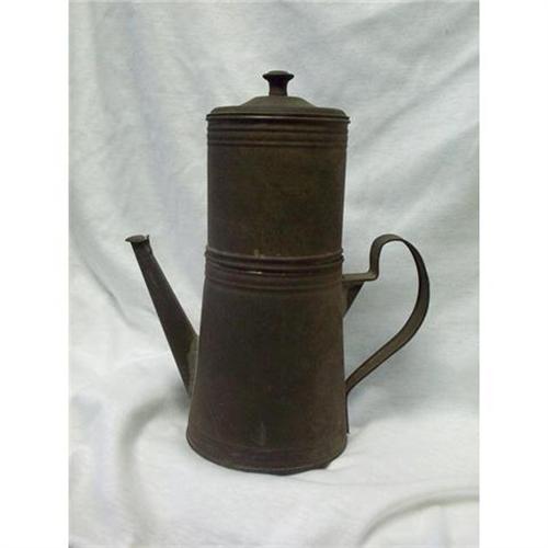 An outstanding older tin coffee pot. There are four pieces to this pot. The handle and spout have great form and there is a cover over the end of the spout. The top section held the coffee grounds and water was poured through. There is minor surface rust in some spots.