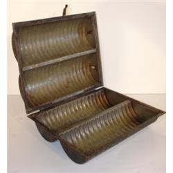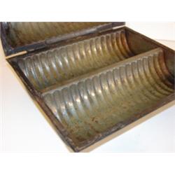 TIN COOKIE CONTAINER. Has original latch. Black painted. Major signs of rusting and pitting and loss to paint. 4.25" H, 11.25" L, 9.5" W