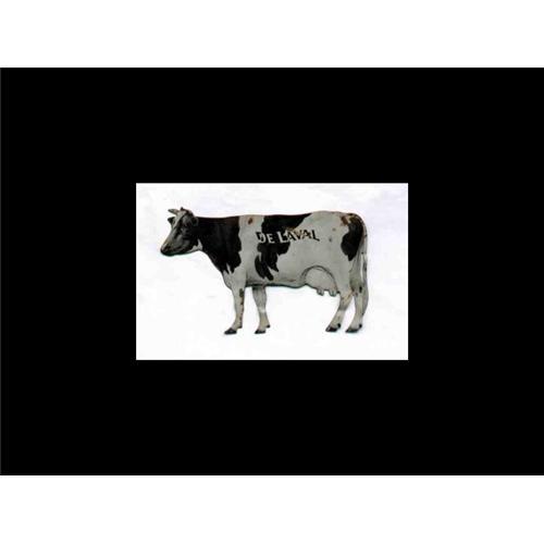This is a tin cow advertising De Laval Cream Separator & Milker. One side of the piece is the cow and other side is the advertising information. It indicates this piece is by American Art Sign Co, Brooklyn, N.Y. Both sides of the piece have a small amount of rust and it appears that 3 legs and the tail have small bends in the tin.