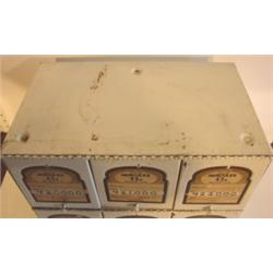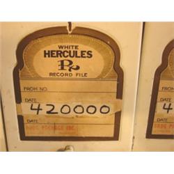TIN DRUGGIST FILE BOX. White painted tin file box with six doors in front. Doors are marked with paper label "White Hercules-Record File-Drug Package Inc.-O'Fallon-Missouri". Original files from 1962 and 1963 are included in all 6 compartments. 12.75" H, 15.5" W, 9.5" D