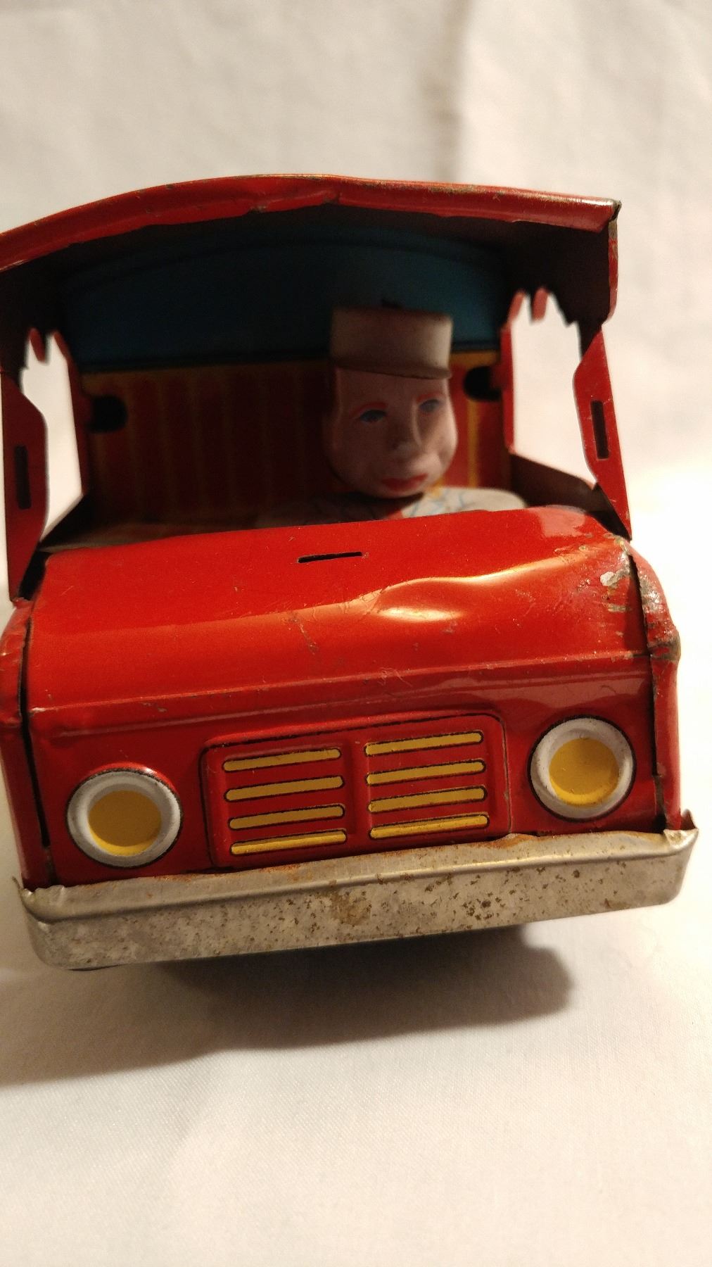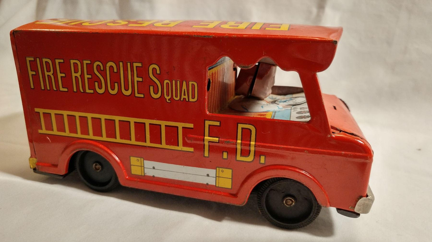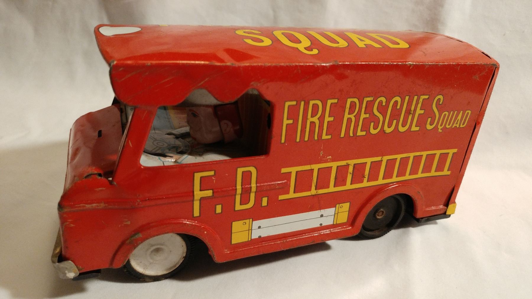 APPROX 7", TIN FIRE RESCUE SQUAD TRUCK, NO KNOWN MAKE, CONDITION F, MISSING WINDSHIELD.
