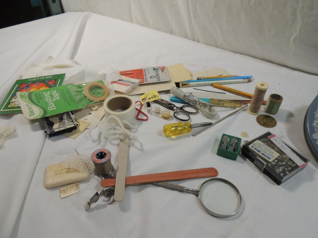 NEEDLES THREAD LINING ASSORTED SEWING SUPPLIES AS SHOWN SEE PHOTO FOR MORE DETAILS.
