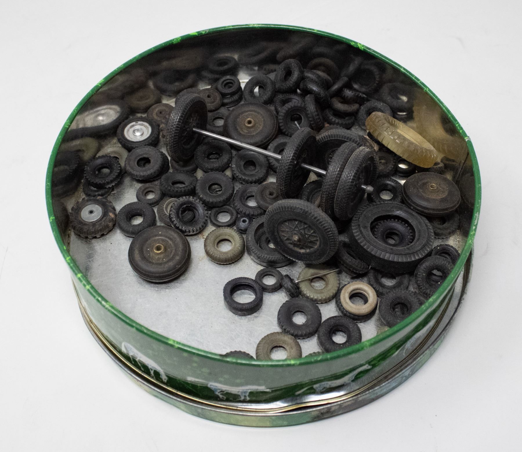 TIN FULL OF VINTAGE TOY VEHICLE TIRES FOR SPARES