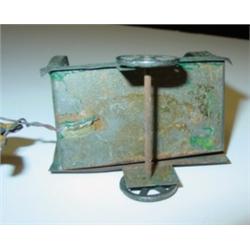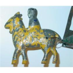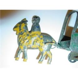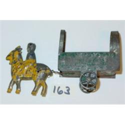 Tin horse and rider pulling a cart that rolls on a pair of steel 6 spoked wheels. Punched tin horse appears to have been made by folding over a form w/identical shape, then soldering the tin. Golden yellow horse has half its original paint, green cart has lost most of its color. Wire connecting the two may be an old replacement. Unmarked 5.5" long.
