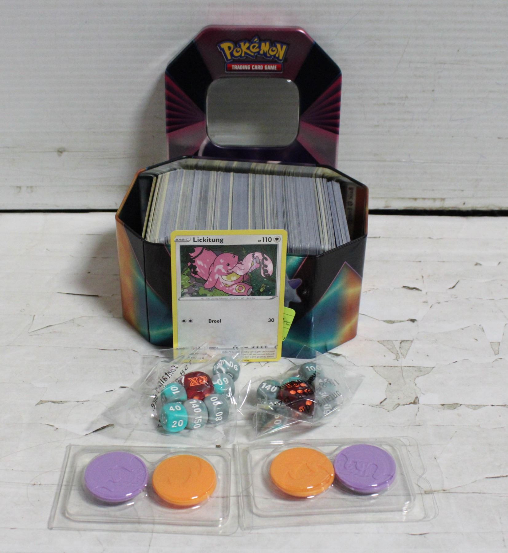 TIN MISC. POKEMON CARDS/DICE/COIN
