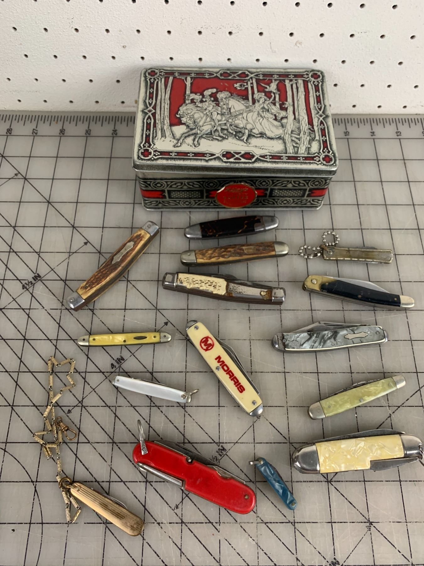 TIN OF VINTAGE POCKET KNIVES SOME NEED WORK