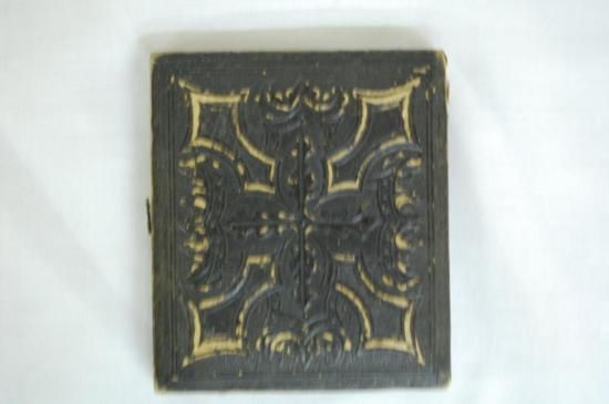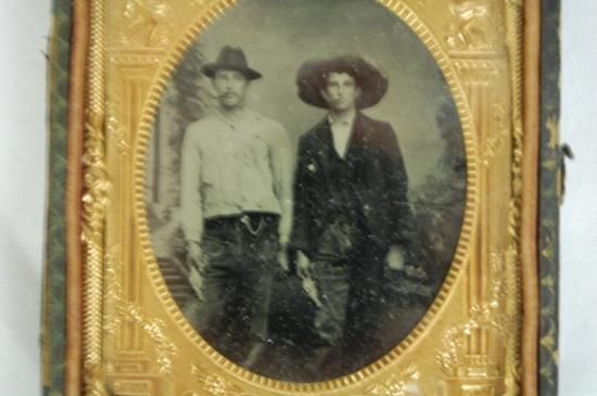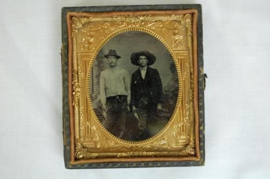 ET0523120031 TIN TYPE. 2 WESTERN MEN HOLDING THEIR SIX SHOOTERS, BOTH HAVE CIGARS AND GUNS / REVOLVERS. THERE IS A NAME WRITTEN ON THE BACK. RUSH?LLI?. 3.5 X 3 INCHES.