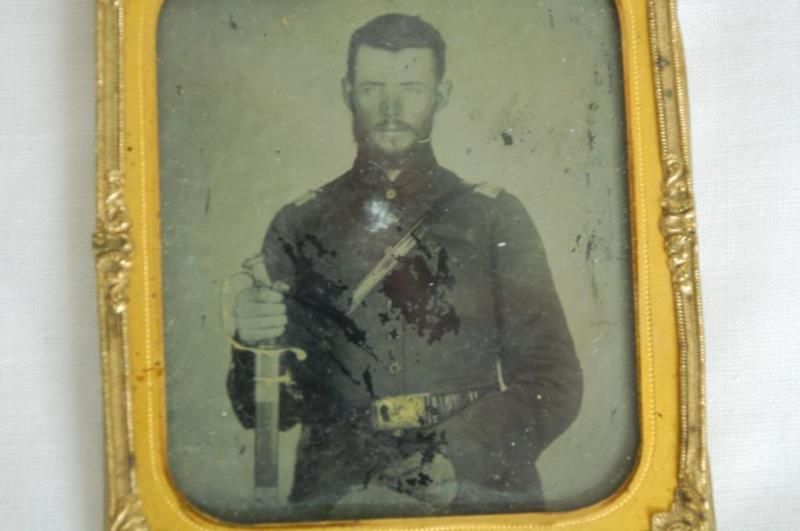 TIN TYPE. CIVIL WAR SOLDIER W/ SWORD, 3.5 X 3 INCHES.