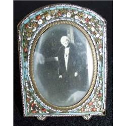 3" by 2 1/4" Tin type in brass frame, mosaic design with brass fillet, twisted stand, made in Italy. Woman in fur image. Early 20th century. Good condition.
