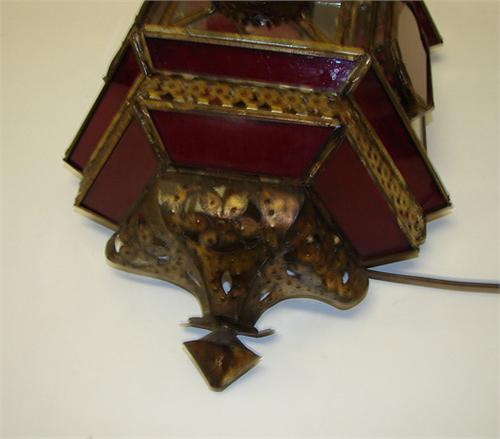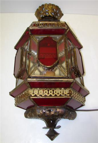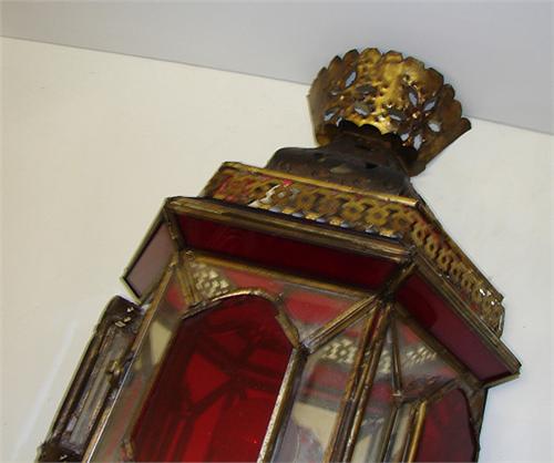 TIN WALL LANTERN. Has ruby and clear glass panels. Shows loss to gilt. Electrified. 21” H