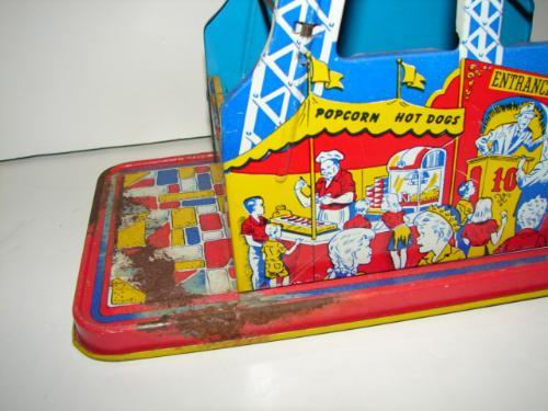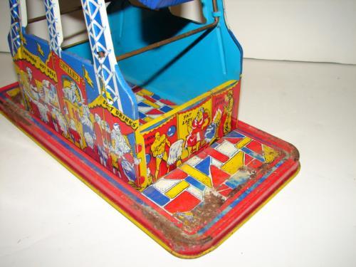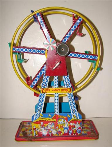 TIN WIND-UP ‘THE GIANT RIDE’ TOY FERRIS WHEEL. Tin base and wheel has 6 plastic seats. Shows rusting at base. 16.5” H