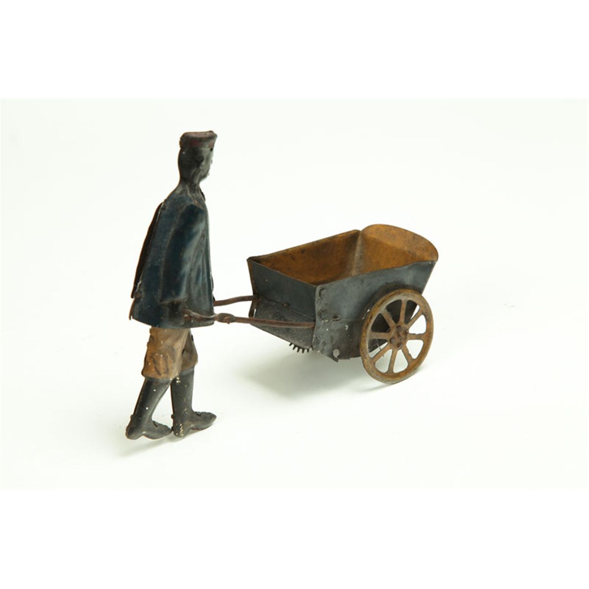 Strauss, New York, 1st quarter-20th century. Tip Top, The Black Porter. Figure of a man pushing a wheelbarrow, with its original paint. Some wear and bends. 6 1/4"l. Ex Scherre Mumpower (Ohio).