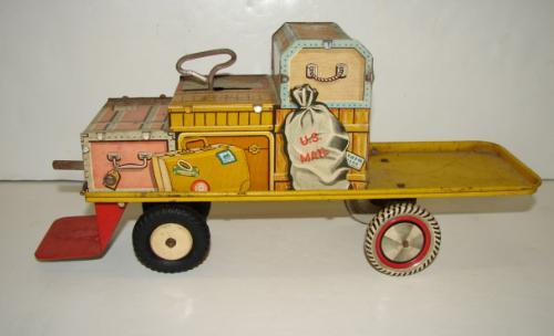 TIN WIND-UP LUGGAGE CART TOY. Wind-up luggage cart has a pair of rubber wheels and a pair of tin wheels. Cart shows severe rusting at one side. 13.5” L