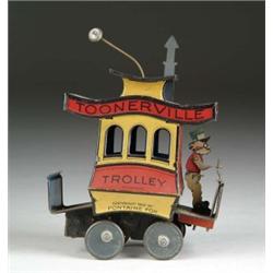 TIN WINDUP TOONERVILLE TROLLEY BY NIFTY.  The classic Toonerville that wobbles about in a comical manner when wound-up.  Usually the litho on this toy darkens with age, however this example is still bright and shiny and in working order.  SIZE:  5” l.  CONDITION:  Very fine plus.  JL 1-4544 (450-550)