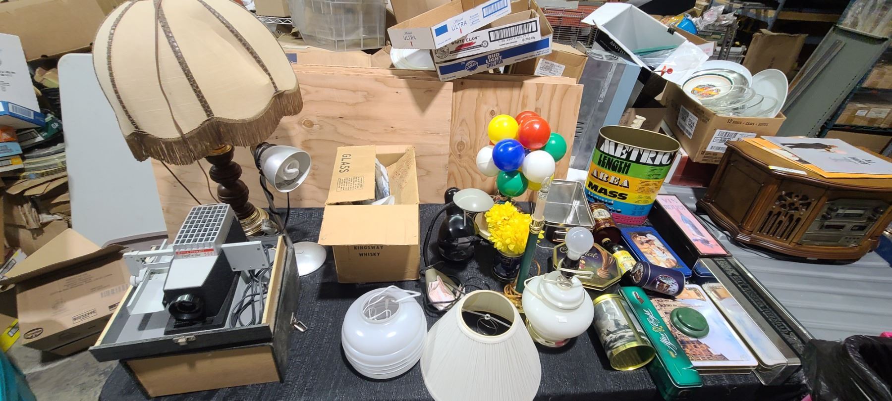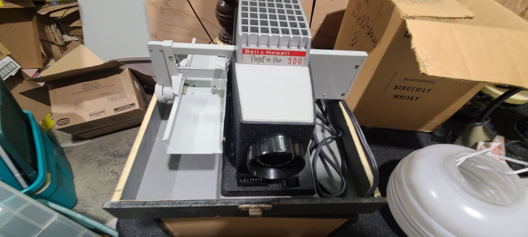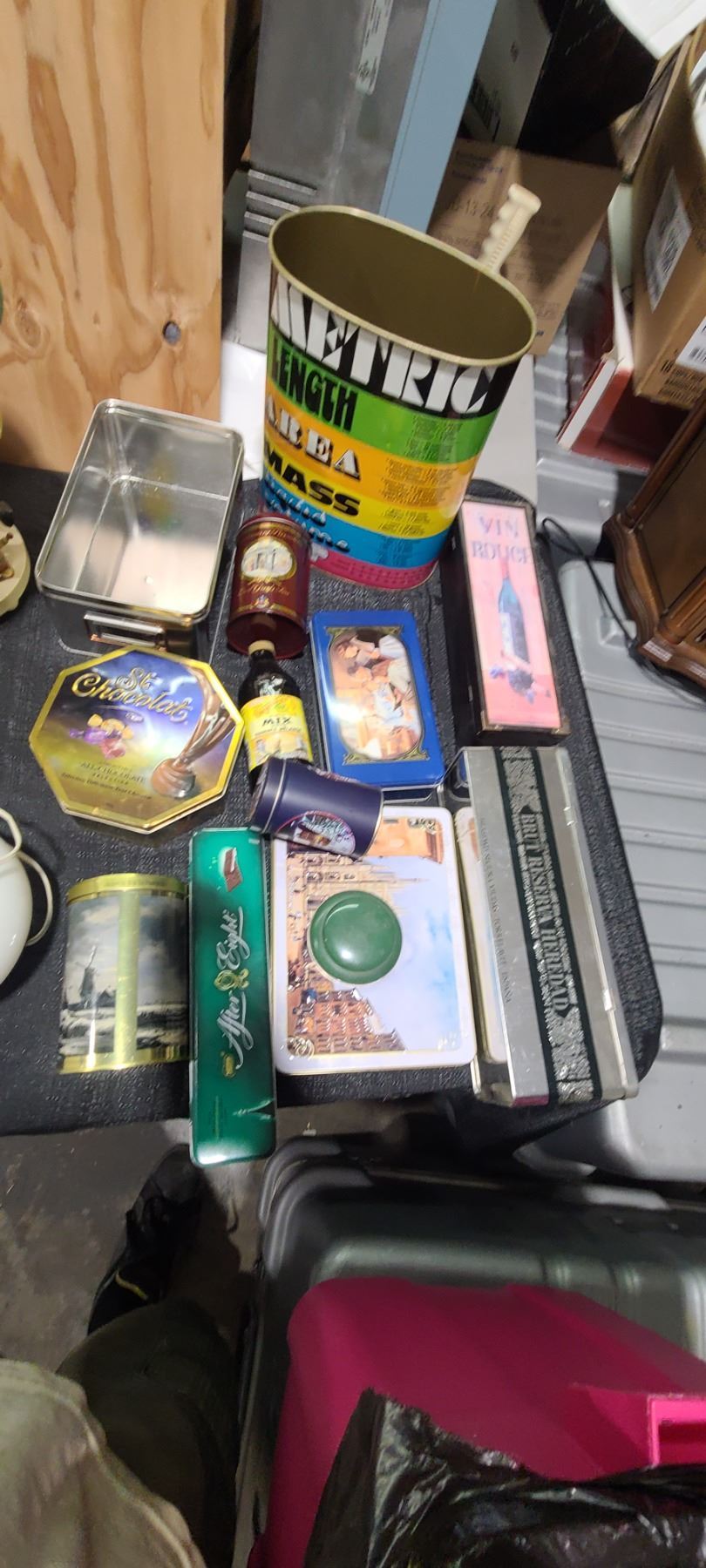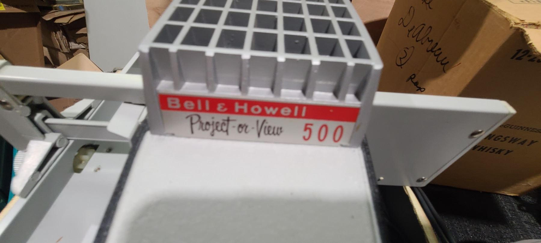 TINS, VANILA EXTRACT, SLIDE REEL PROJECTOR, LAMPS