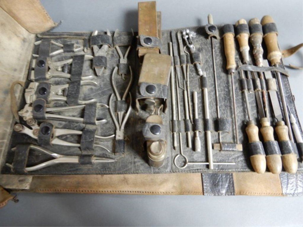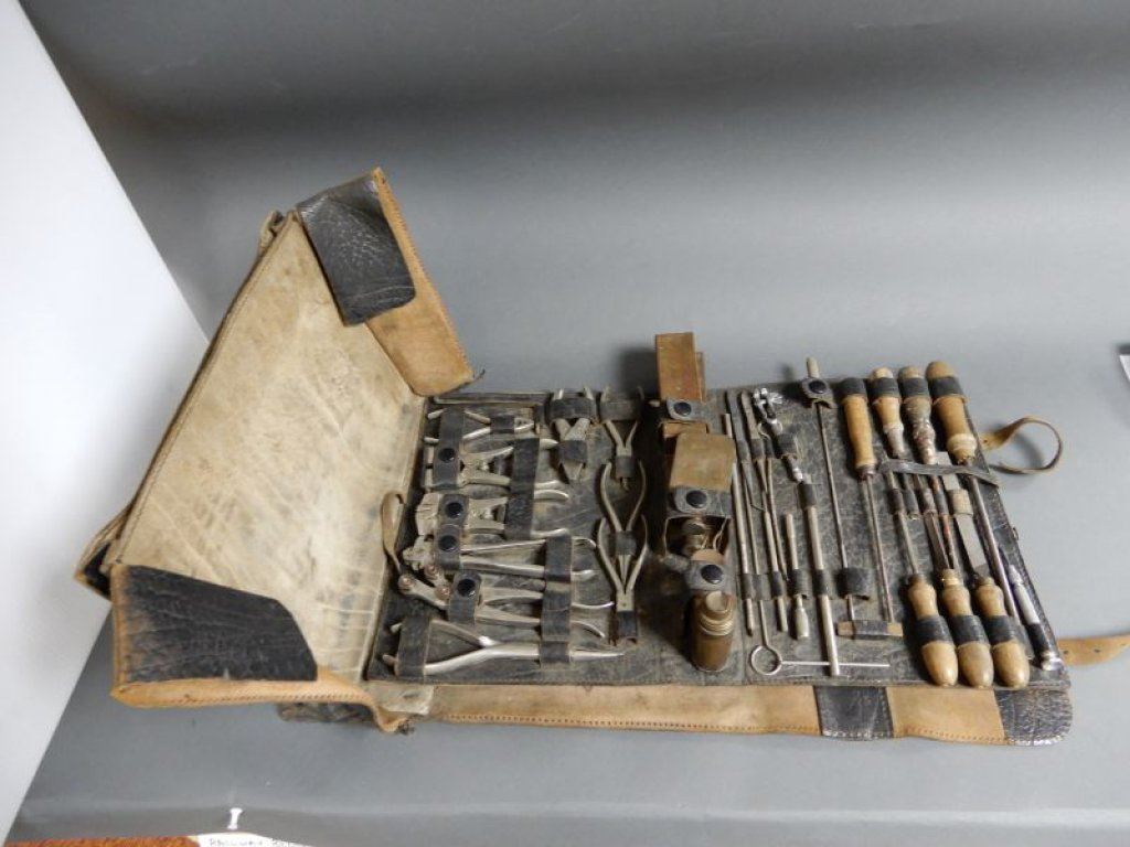 TINSMITH TOOL KIT IN LEATHER ATTACHE CASE BUCHNER TOOLS- HAND VICES- CRIMPING TOOLS- FILES LOCATION: LOWER BACKROOM
