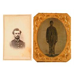 TINTYPE & CDV OF CIVIL WAR SOLDIERS. The tintype, a full length view of a standing uniformed enlisted man unarmed. Together with CDV of a Civil War officer inscribed in period ink on the reverse "H. P. French Captain 3rd VT Vols". The tintype is possibly that of David H. Bracket and was acquired from the attic of his descendents in Berwick, ME. Bracket enlisted as a Private in Company B of the Maine 27th Infantry September 30, 1862 and later attained the rank of Corporal. SIZE: Tintype is 3-1/4" wide x 4-1/4" tall. CDV is 2-1/2" wide x 4" tall. CONDITION: Various age separations, but generally in good condition. The CDV with a small stain. 4-53630