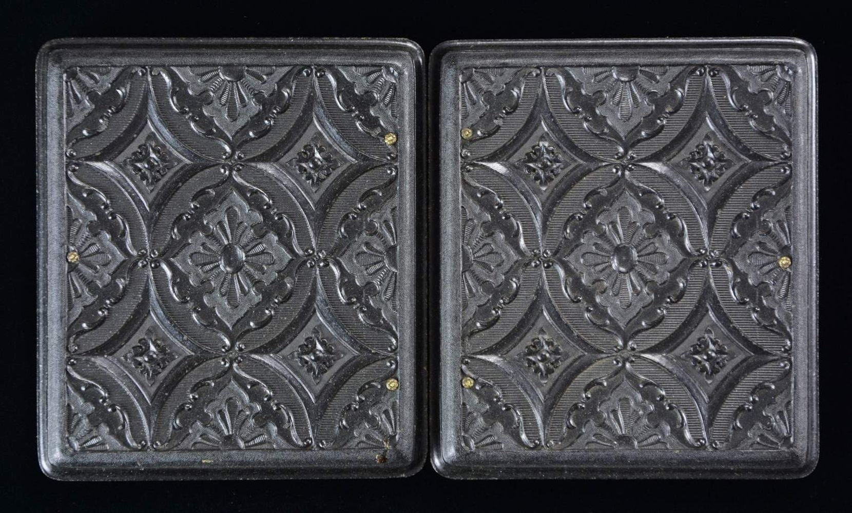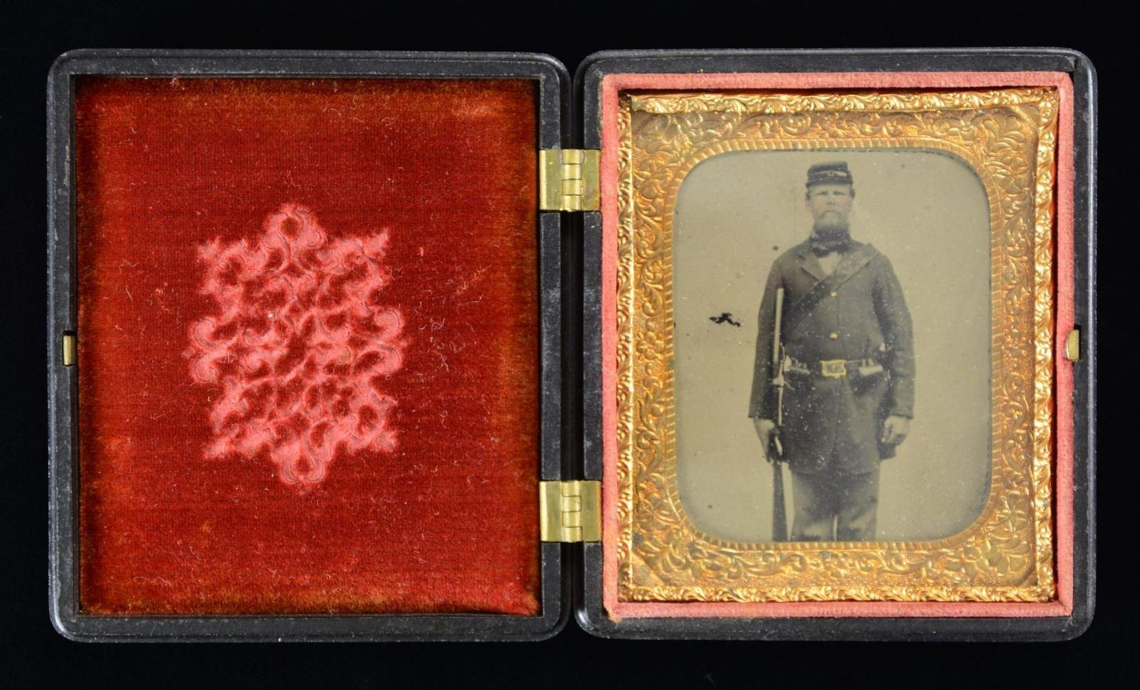 This 6th plate tintype has a very interestingly clothed soldier, likely of the Cavalry, that appears to be a Private. He wears a long coat resembling a frock coat with an open lapelled collar and 3 buttons down the front. He appears to wear a model 1851 eagle buckle on belt with 2 cap pouches in the front. He has an over-the-shoulder sling, presumably for the carbine he holds in his right hand. On his head is a standard enlisted kepi. Gilded brass mat & frame. Thermo-plastic case marked, in part, “Littlefield, Parsons & Co., MANUFACTURERS OF Daguerreotype Cases.”. CONDITION: image has a few barely noticeable creases and one small loss of emulsion in the field, not affecting the soldier. Mat & frame are complete. Case is undamaged. (02-20980/BF). $800-1,400.