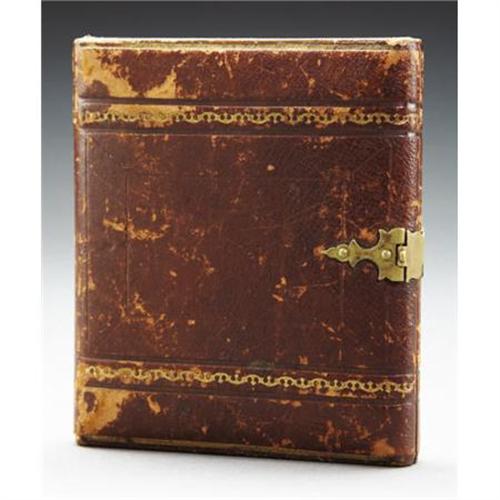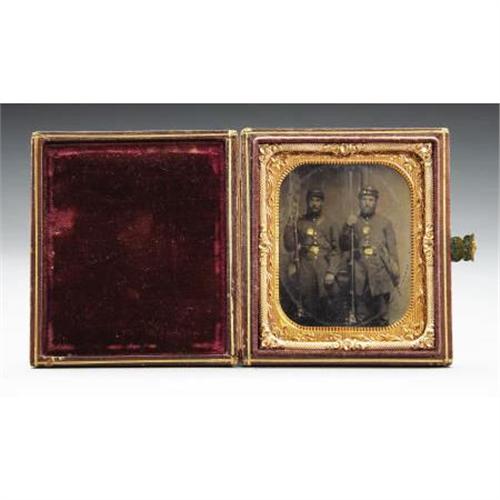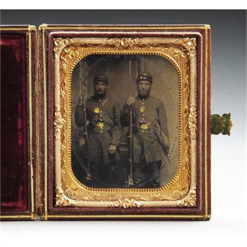<B>TINTYPE SIXTH PLATE OF TWO FULLY EQUIPPED UNION PRIVATES CA 1860S.</B></I> The privates in this great cased tintype both have bayoneted Springfield rifles and ammo pouches. One has a revolver stuck in his belt and shows his canteen. The photographer has gilded all the buttons and belt buckles of these two Federal troops. Housed in leather case, with a replacement gilded frame. <BR><B><BR>Condition:</B></I> Fine, minor light scratches on tin.<BR><BR><b>Shipping:</b> Miscellaneous Collectibles, Larg (<a target="_blank" href="http://www.heritageauctions.com/common/shipping.php">view shipping information</a>)