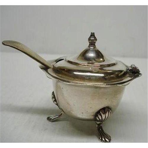 LOVELY ANTIQUE STERLING SILVER CONDIMENT DISH, IT IS ENGLISH MADE AND FULLY HALLMARKED - AS PER IMAGES - IT IS SUCH A GEM, WITH FIGURAL VICTORIAN STYLE FEET, HINGED TOP SCALLOPED EDGE AND THE LOVELY LITTLE KNOB ON THE TOP OF THE LID,IT COMES WITH CONDIMENT SPOON O.K. SPECIAL,  Excellent condition free of dents, rust or cracks, It stands about 2 1/2" high and about 2 1/2" in diam., US Buyer to pay 7.00 plus insurance.THANKS.
