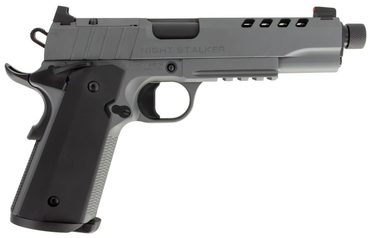 The Nightstalker SF is a full-size 1911 pistol with an integrated picatinny rail that comes from the factory with a long list of features that include a skeletonized hammer, SF trigger and ambidextrous safety, extended beavertail grip safety, aluminum grips and rear slide cocking serrations. Built on our forged frame and slide for durability with our cold hammer forged barrels for accuracy, the Nightstalker 1911 is ready for whatever comes at you.