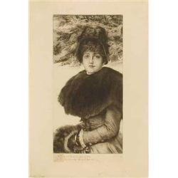 TISSOT, James - She will bring in spite of frost Beauties that the earth hath lost, 1880. Pointe sèche, 56,2 x 26,5 cm, vergé de Hollande Van Gelder légèrement teinté à belles marges; sign. et date dans le cuivre et cachet monogrammé rouge dans le coin inf. dr. Légère mouillure dans la marge inf. n'affectant pas le motif, une petite rousseur dans le champ. € 1000/2000 Jeune femme enveloppée de fourrures sur fond de paysage enneigé; tirée d'un poème de Keats, la légende est gravée en rouge dans la marge inf. et débute par une grande lettre ornée. Superbe pièce. Ref. Bénézit 10, 1976, p. 199 : Nantes 1836-Buillon 1902, peintre, dessinateur, aquafortiste et modeleur; il vécut quelques années à S. John's Wood, dans la banlieue londonienne, et travailla la gravure à côté de Seymour Haden.