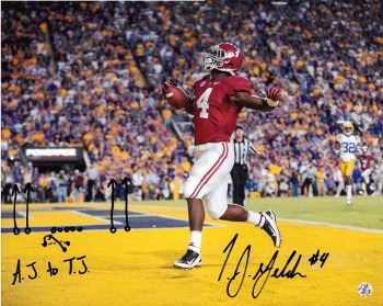 As a true freshman in 2012, TJ Yeldon played in all 14 games, sharing time with Eddie Lacy. In his first college game, Yeldon rushed for 111 yards and a touchdown. His season high for the year was 153 yards against Georgia in the 2012 SEC Championship Game. In the 2013 BCS Championship Game victory over Notre Dame, Yeldon ran for 110 yards and had one touchdown. Yeldon finished the season with 1,108 rushing yards on 175 carries and 12 touchdowns. After Lacy entered the 2013 NFL Draft, Yeldon became Alabama's starter his sophomore season in 2013. Yeldon led the team with 1,235 yards on 207 carries and 14 touchdowns. He was named first-team All-Southeastern Conference (SEC) selection. Yeldon shared carries with Derrick Henry his junior season in 2014. After his junior season, Yeldon entered the 2015 NFL Draft TJ Yeldon has hand signed this Alabama Crimson Tide 16X20 Photo with inscription AJ to TJ with diagram of play. Bama Authentics Hologram and Certificate of Authenticity from Athlon Sports Collectibles.