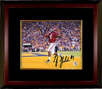 As a true freshman in 2012, TJ Yeldon played in all 14 games, sharing time with Eddie Lacy. In his first college game, Yeldon rushed for 111 yards and a touchdown. His season high for the year was 153 yards against Georgia in the 2012 SEC Championship Game. In the 2013 BCS Championship Game victory over Notre Dame, Yeldon ran for 110 yards and had one touchdown. Yeldon finished the season with 1,108 rushing yards on 175 carries and 12 touchdowns. After Lacy entered the 2013 NFL Draft, Yeldon became Alabama's starter his sophomore season in 2013. Yeldon led the team with 1,235 yards on 207 carries and 14 touchdowns. He was named first-team All-Southeastern Conference (SEC) selection. Yeldon shared carries with Derrick Henry his junior season in 2014. After his junior season, Yeldon entered the 2015 NFL Draft TJ Yeldon has hand signed this Alabama Crimson Tide 8x10 Photo. Bama Authentics Hologram and Certificate of Authenticity from Athlon Sports Collectibles. Custom Black Mat and Premium Mahogany Color Framed as shown.