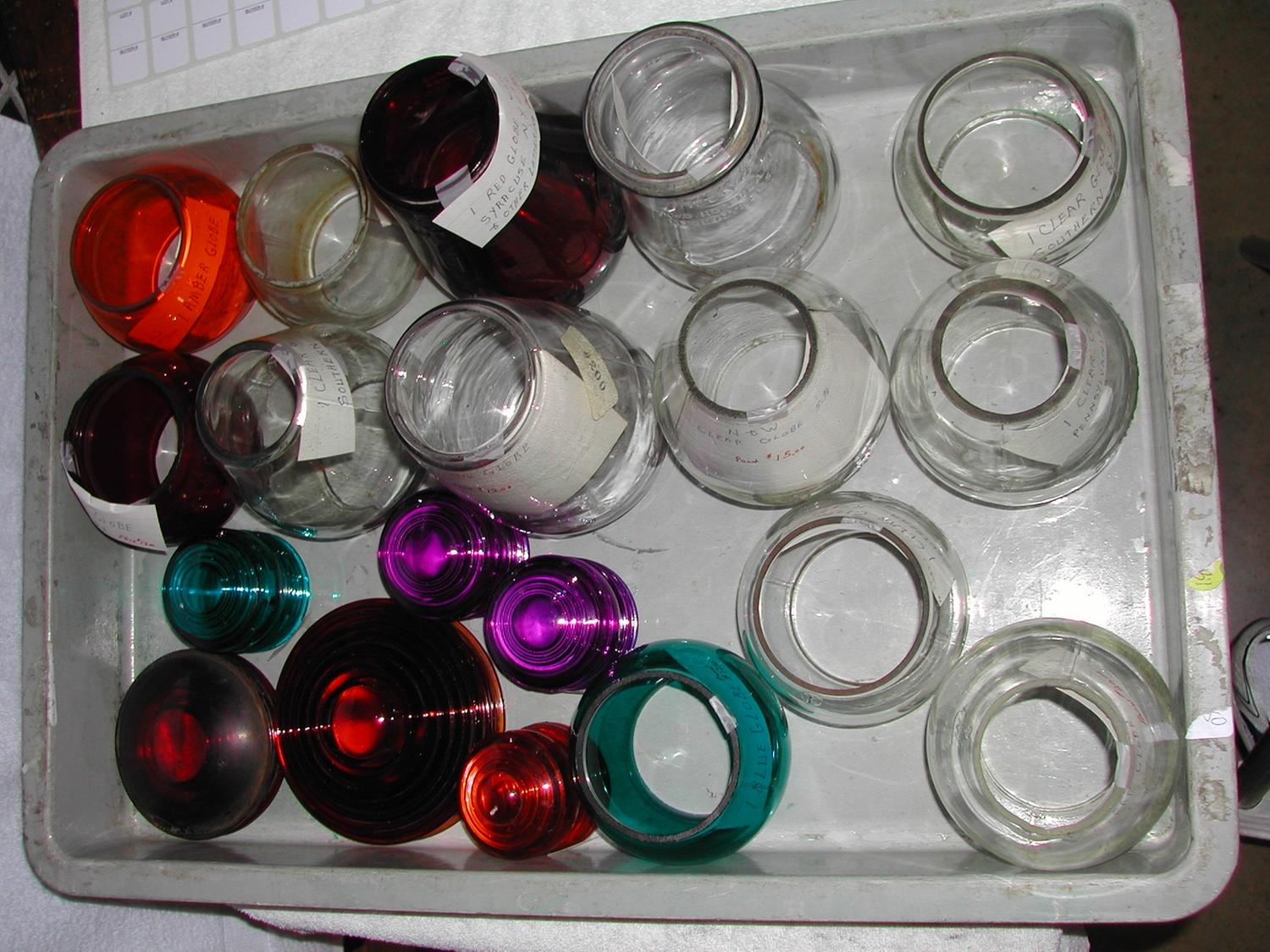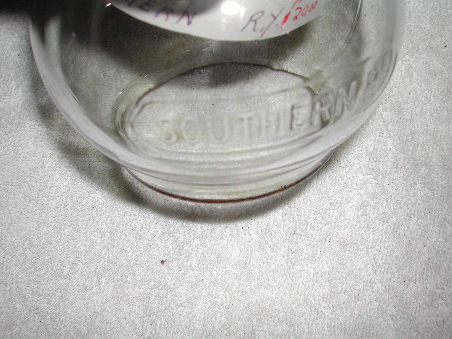 TL: GLOBES AND LENSES, 20 GLASS ITEMS: 5 3/8 N&W CLEAR GLOBE, 5 1/2" C&O CLEAR GLOBE, 5 3/8" PENNSYLVANIA LINE CLEAR GLOBE, 3 3/8" 1925 SOUTHERN RY CLEAR GLOBE, 3 3/8" B&O RED GLOBE, (2) 4 1/2" RED LENS, 5 1/2" AMBER LENS, ASSORTED OTHER GLOBES
