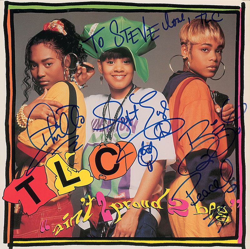 Ain’t 2 Proud 2 Beg album signed on the front cover in blue felt tip by Lisa ‘Left Eye’ Lopes, Rozonda ‘Chilli’ Thomas, and Tionne ‘T-Boz‘ Watkins, with one adding an inscription to “Steve.” In very fine condition. The record is included. Accompanied by a full letter of authenticity from Roger Epperson/REAL.