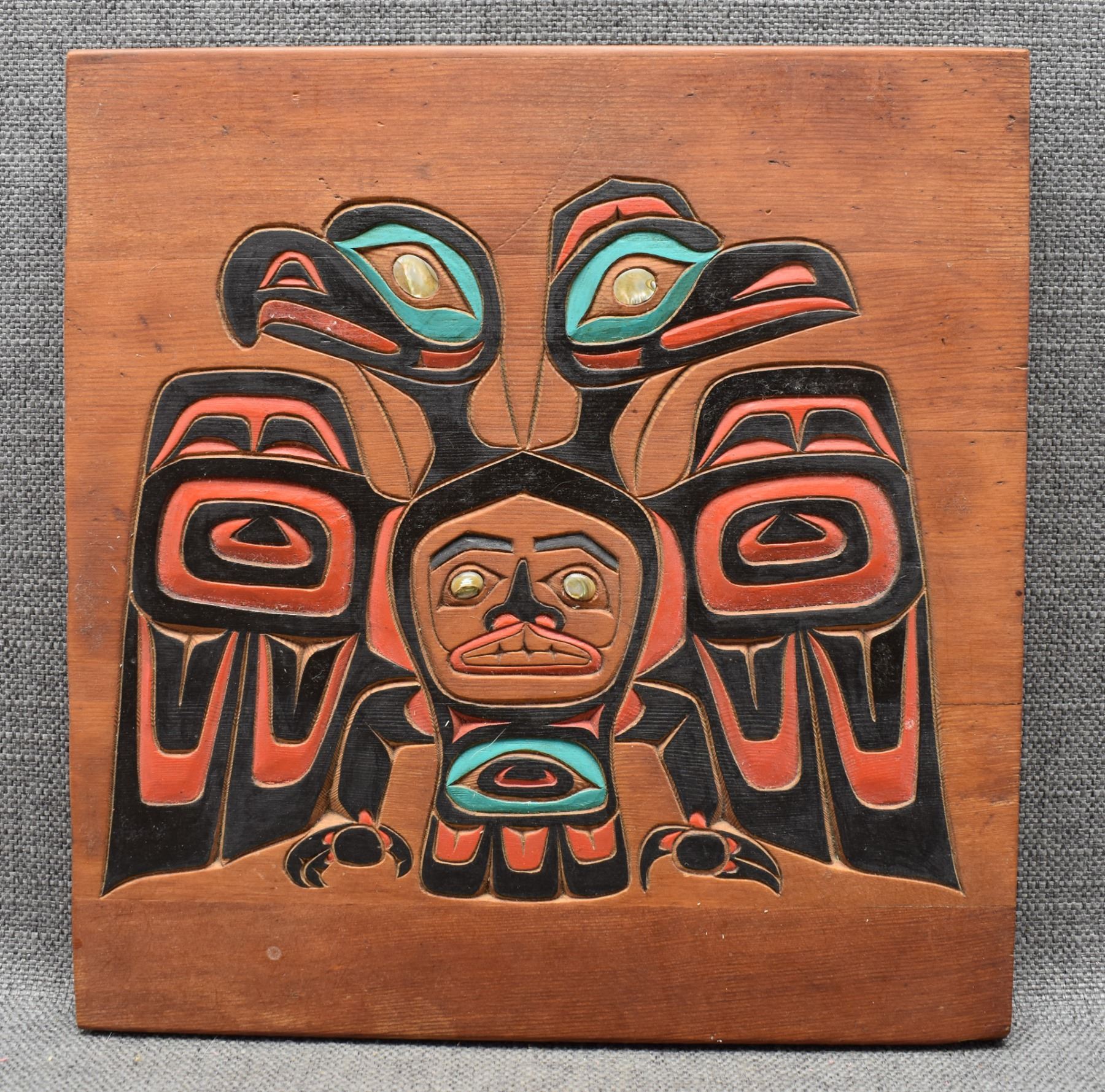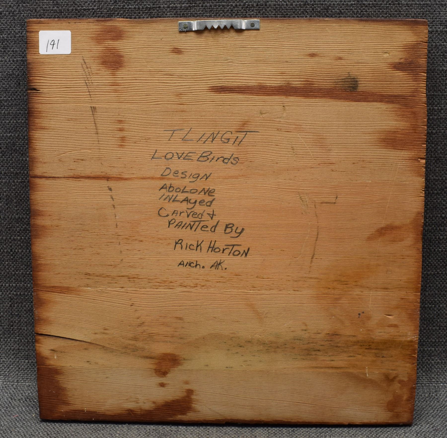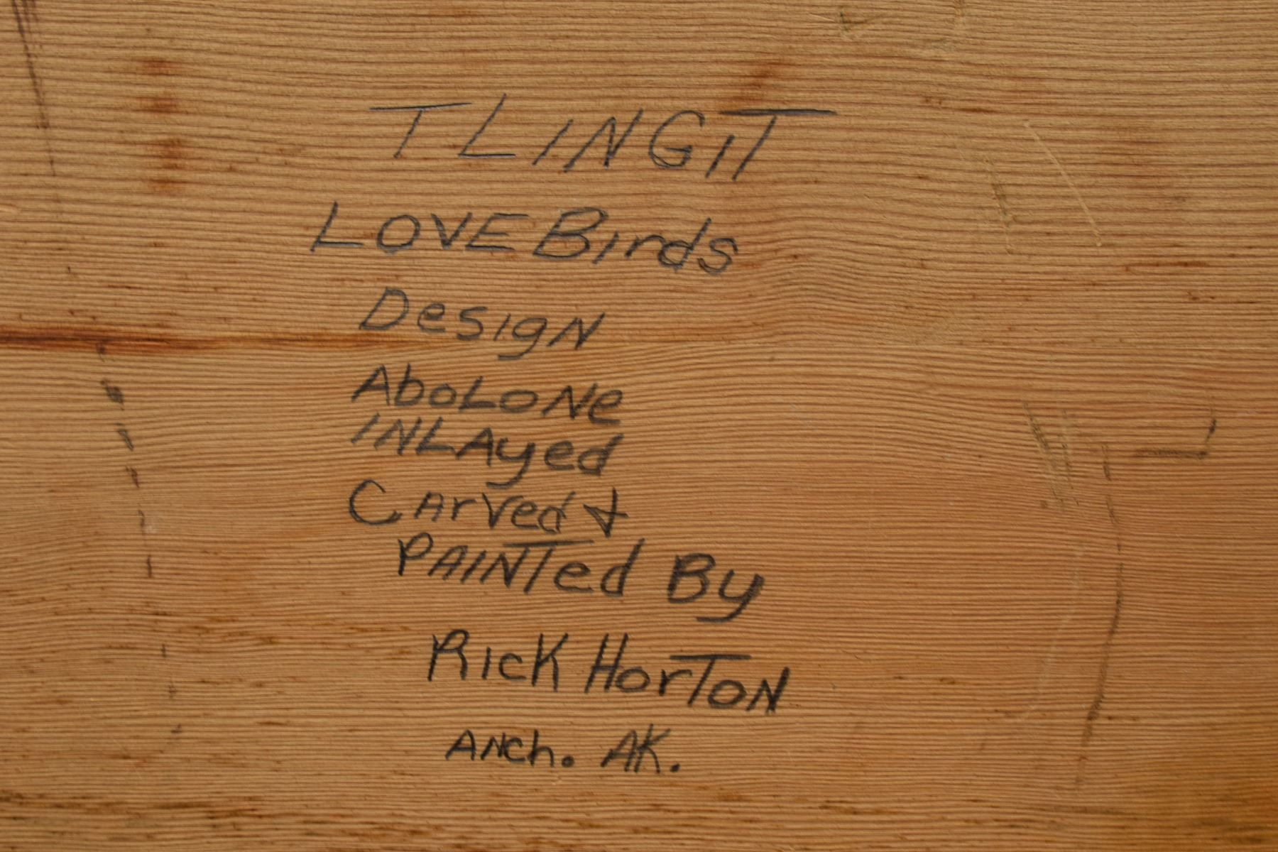 1970-80's Tlingit Indian hand carved and painted with abalone inlay titled "love Birds" signed Rick Horton 11.25" x 10.75"